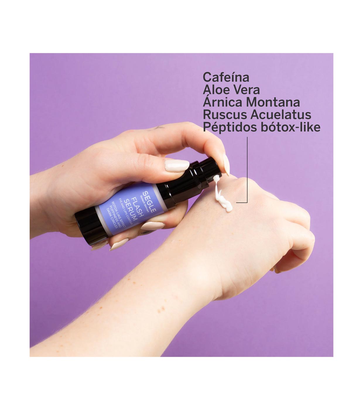 - Cafeína: por estimular a circulação e ter efeito drenante da pele, esse ingrediente do Flash Serum é muito eficaz na redução de bolsas.