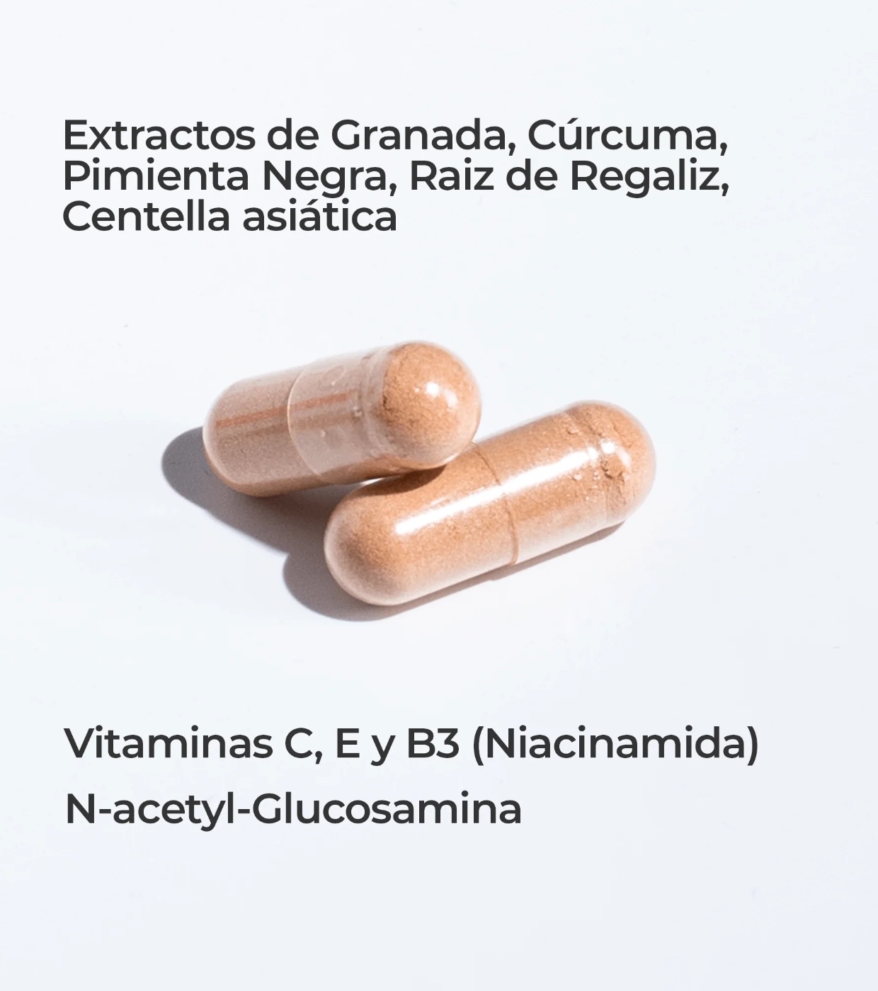 POMANOX® P30 [EXTRACTO SECO DE FRUTO DE GRANADA (PUNICA GRANATUM L.) 30% PUNICALAGINAS Y 8% ÁCIDO ELÁGICO], CÁPSULA [AGENTE DE RECUBRIMIENTO (HIDROXIPROPILMETILCELULOSA)],N-ACETIL-D-GLUCOSAMINA,CURCUMIN C3 REDUCT® (TETRAHIDROCURCUMINOIDES), EXTRACTO SECO DE RAÍZ DE REGALIZ (GLYCYRRHIZA GLABRA L.) 20% GLICIRRICINA, EXTRACTO SECO DE PARTES AÉREAS DE GOTUKOLA (CENTELLA ASIÁTICA (L.) URB.) 3% ASIATICÓSIDOS, VITAMINA C (ÁCIDO L-ASCÓRBICO), AGENTE DE CARGA (CELULOSA MICROCRISTALINA), NIACINA (NICOTINAMIDA), ANTIAGLOMERANTE (SALES MAGNÉSICAS DE ÁCIDOS GRASOS, DIÓXIDO DE SILICIO), EXTRACTO SECO DE FRUTO DE PIMIENTA NEGRA (PIPER NIGRUM L.) 95% PIPERINA, VITAMINA E (SUCCINADO ÁCIDO DE D-ALFA-TOCOFERILO).