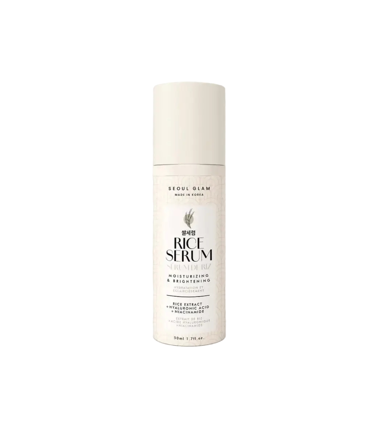 O sérum facial Rice da Seoul Glam é formulado com 33 ingredientes que combinam ceramidas, ácido hialurônico, niacinamida e vitamina E para oferecer um cuidado completo da pele.