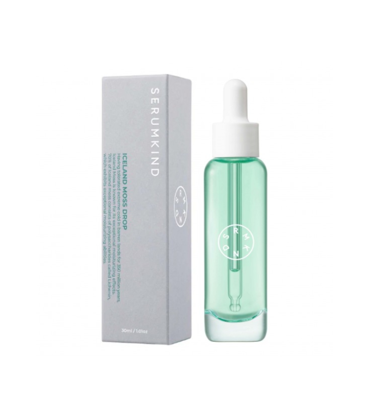 Sérum facial calmante Iceland Moss Drop da Serumkind , formulado com extrato de musgo islandês e malaquita para hidratar intensamente a pele, ajudando a acalmá-la.