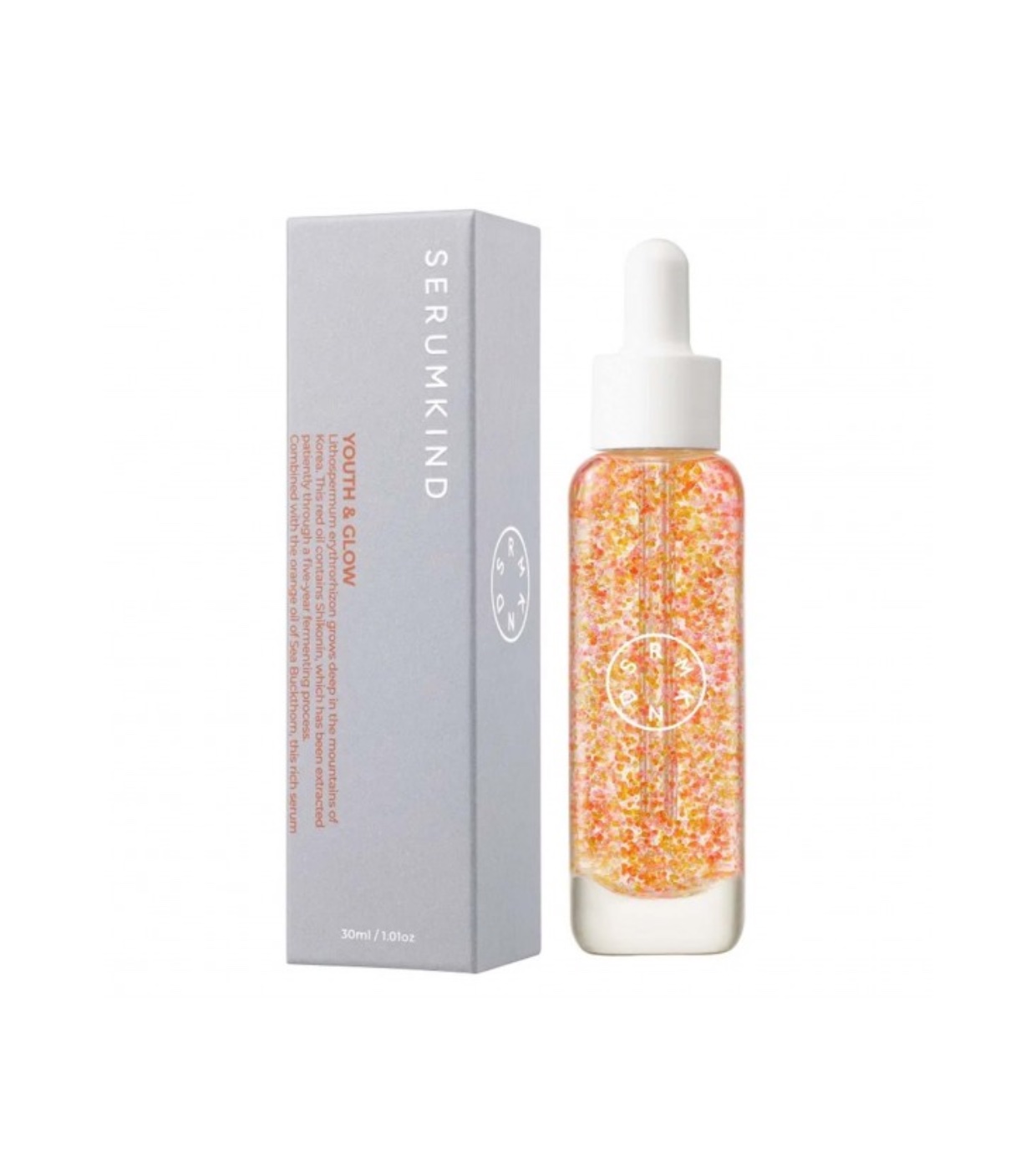Sérum revitalizante para pele madura e sem brilho Youth & Glow da Serumkind, formulado com óleo de espinheiro marítimo e óleo de Shikonin, dois ingredientes naturais com poderosas propriedades antienvelhecimento.