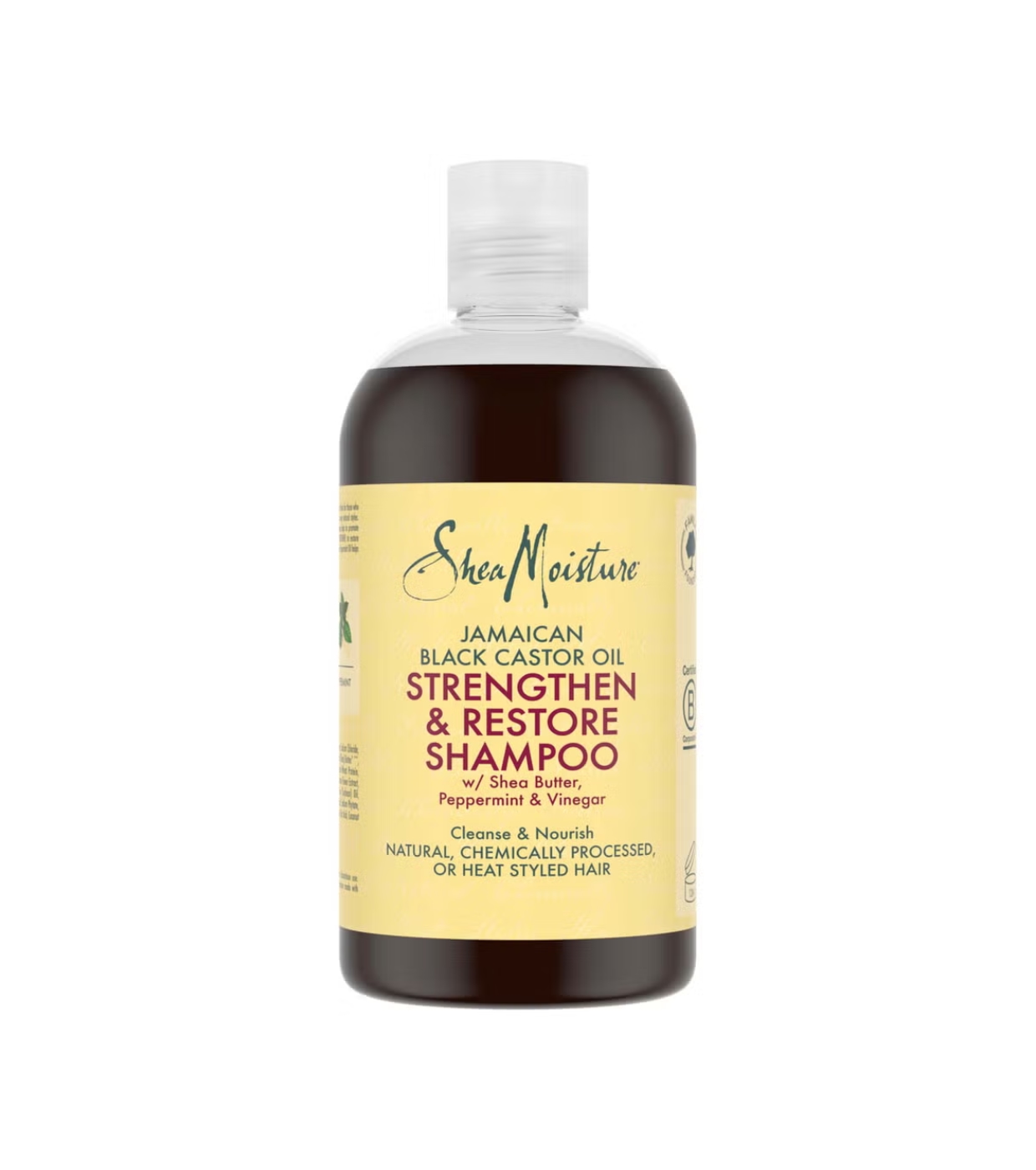 Shea Moisture O óleo de rícino preto jamaicano fortalece e restaura o shampoo.