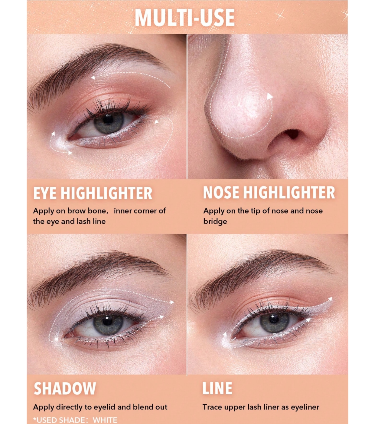 Aplique diretamente na pálpebra e espalhe com os dedos ou um pincel para um acabamento suave. Você também pode usar no canto interno do olho ou abaixo da sobrancelha para adicionar um toque de luminosidade.