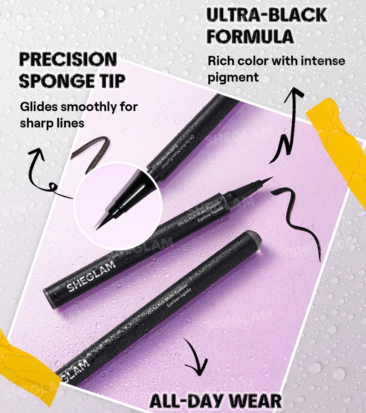 Acabamento mate, intenso e de longa duração: descubra sua nova obsessão. O delineador mate Oh So Rich da SHEGLAM proporciona um acabamento ultramate de alto impacto, sem brilho ou cintilância — apenas um preto puro e profundo.