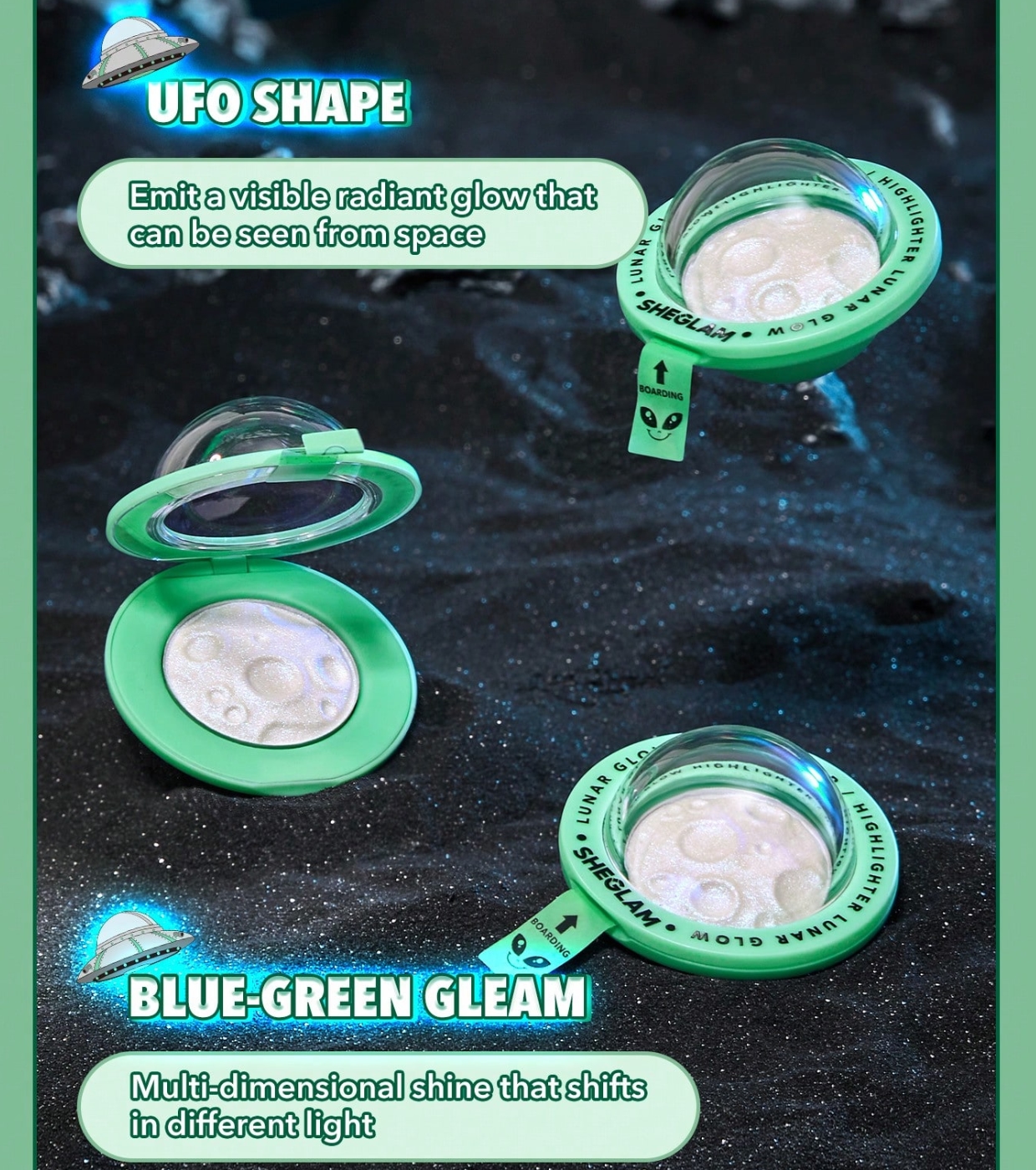Conquiste um brilho que pode ser visto do espaço sideral! Este iluminador Lunar Glow da SHEGLAM, com brilho azul-esverdeado, oferece um acabamento único e futurista que transforma qualquer look em uma verdadeira declaração de estilo.