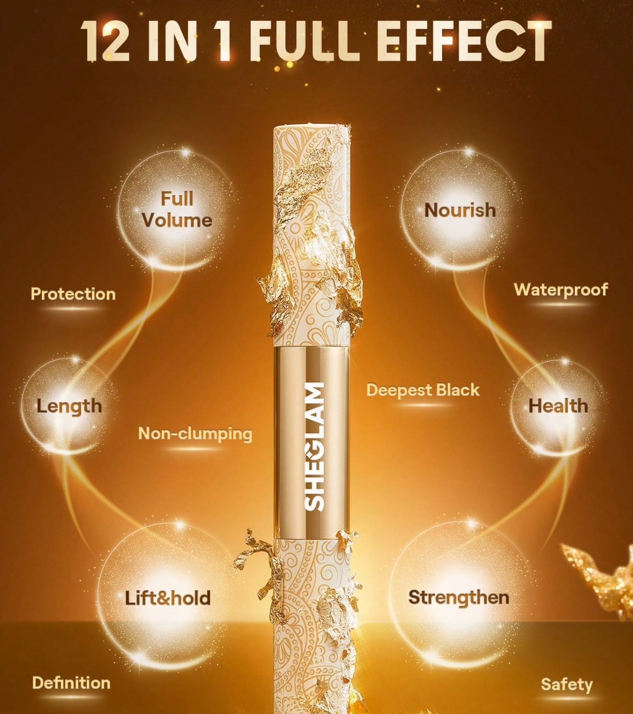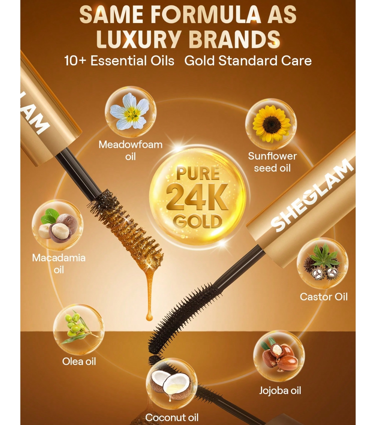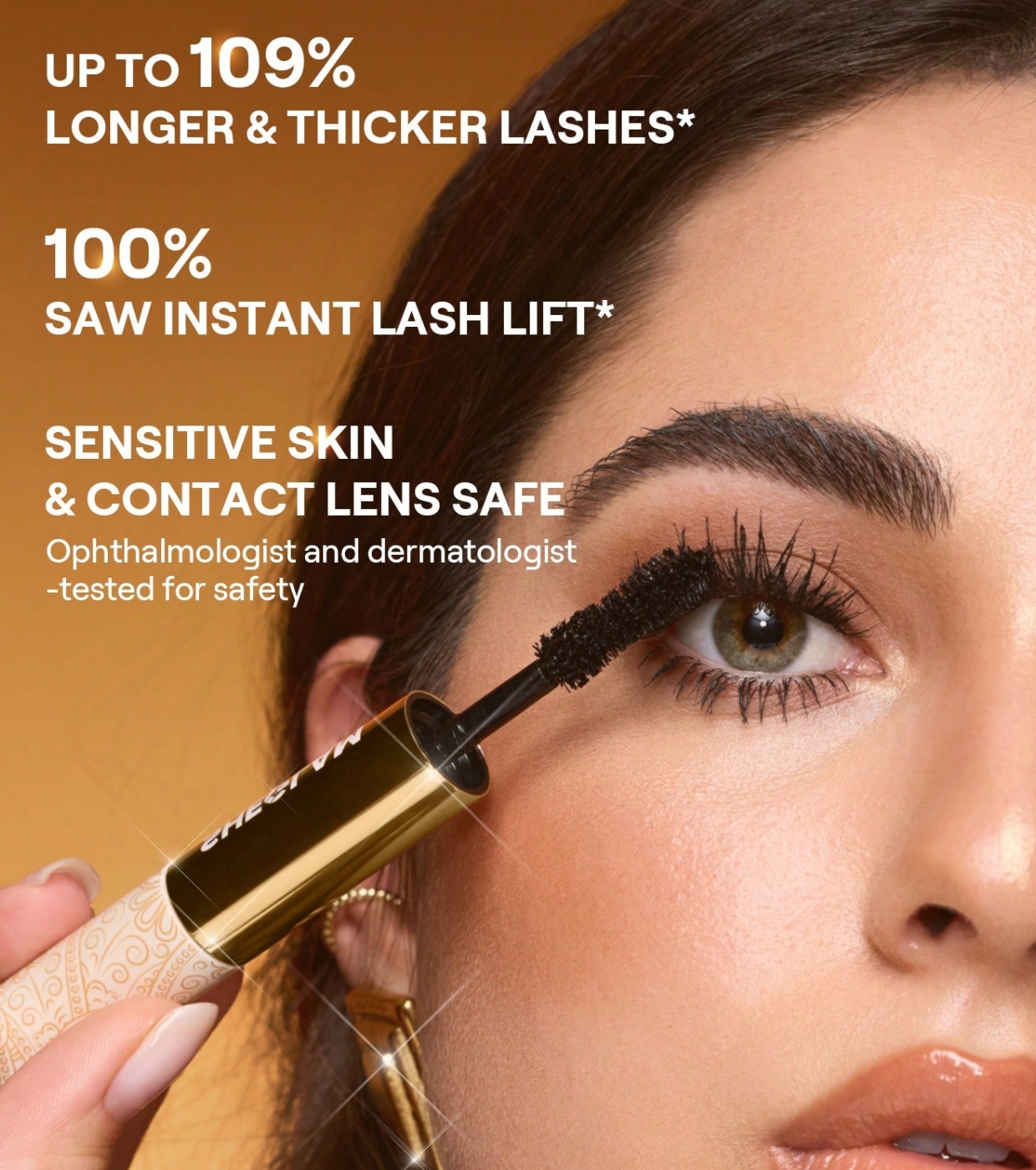 Cílios com aparência luxuosa, mais cheios, curvados e perfeitamente definidos. Um acabamento deslumbrante que transforma seu visual com um toque de glamour dourado.