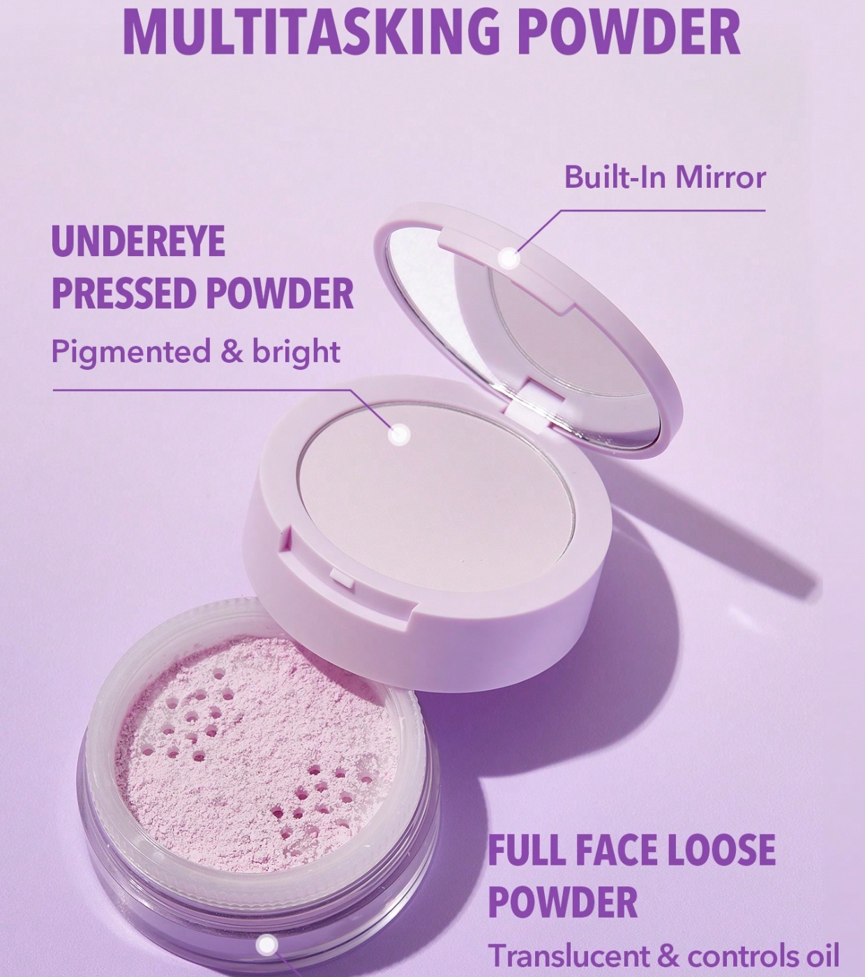 Na parte inferior, contém um pó solto translúcido que absorve o excesso de oleosidade, mantendo o rosto fresco e sem brilho ao longo do dia.