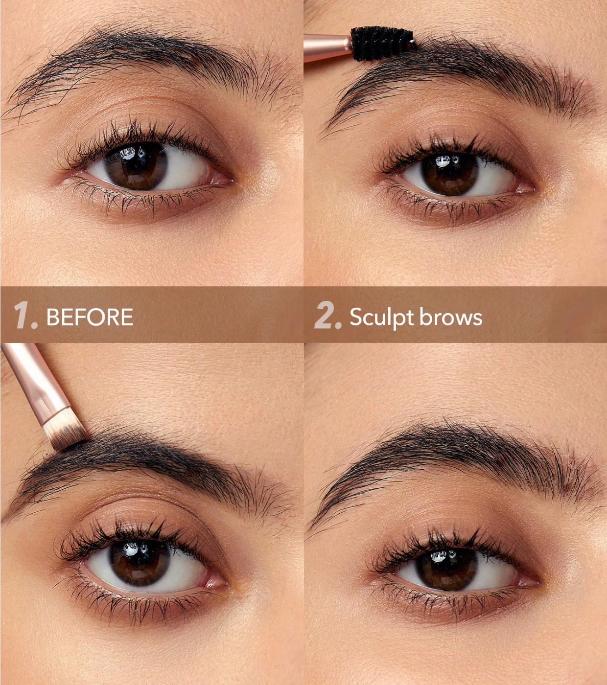 Com a ajuda de um pincel chanfrado, você pode preencher, definir e modelar suas sobrancelhas com precisão, criando desde um acabamento natural até um visual mais estruturado e marcante.