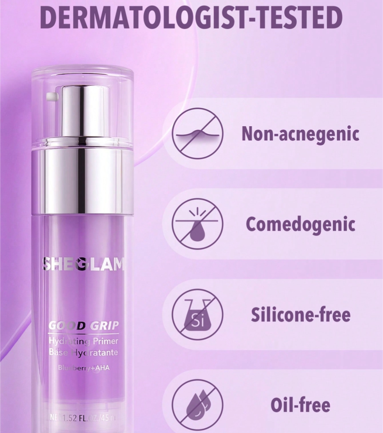 Prepare-se para uma maquiagem impecável! Este primer Good Grip Blueberry + AHA da SHEGLAM, com sua textura refrescante em gel, deixa a pele macia, suave e hidratada desde o primeiro momento.
