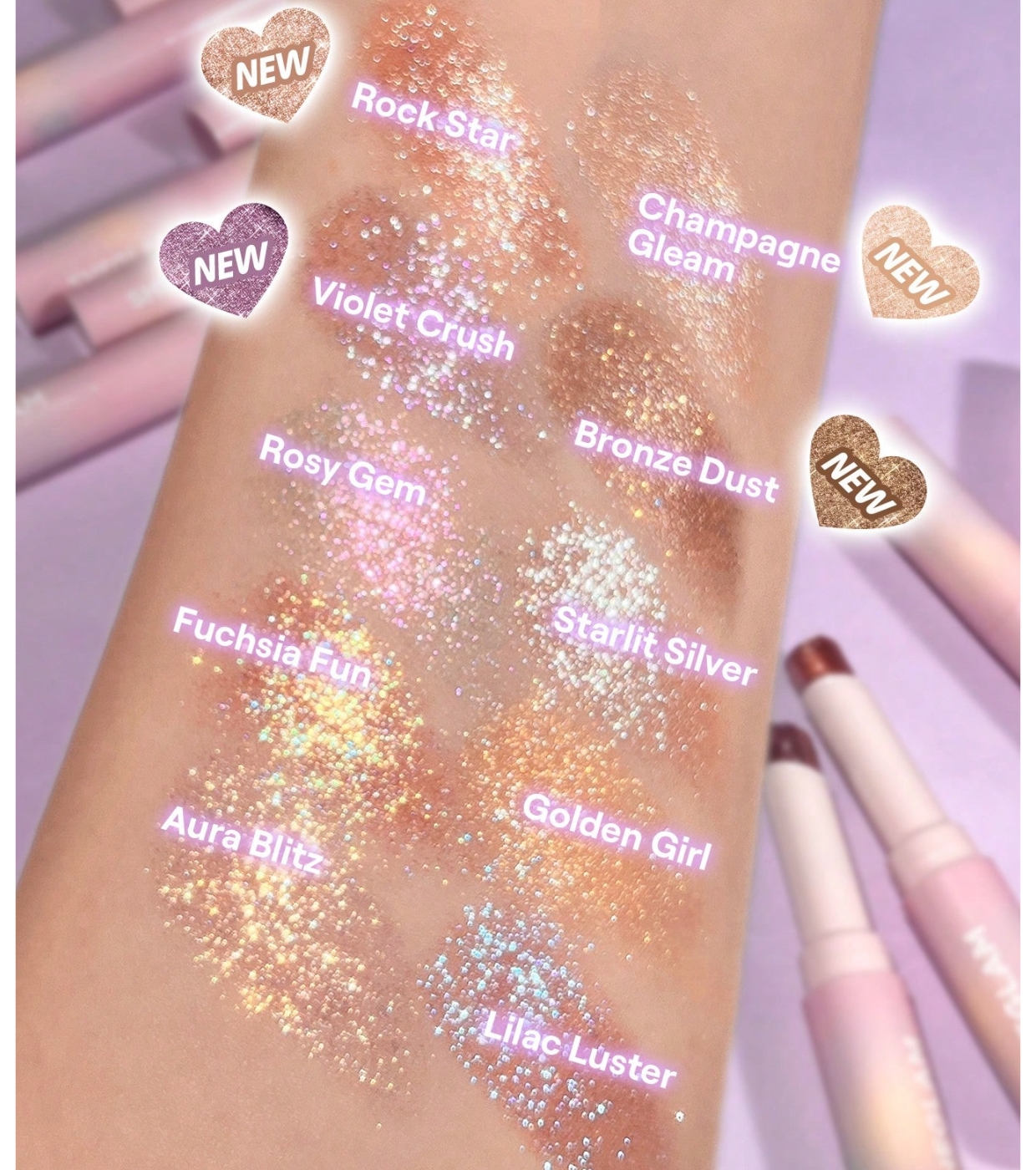 Aumente a intensidade e o brilho com a sombra Crystal Jelly da SHEGLAM , um iluminador em bastão que combina água e pérolas de glitter para criar um acabamento molhado, leve e ultraluminoso com apenas uma passada.