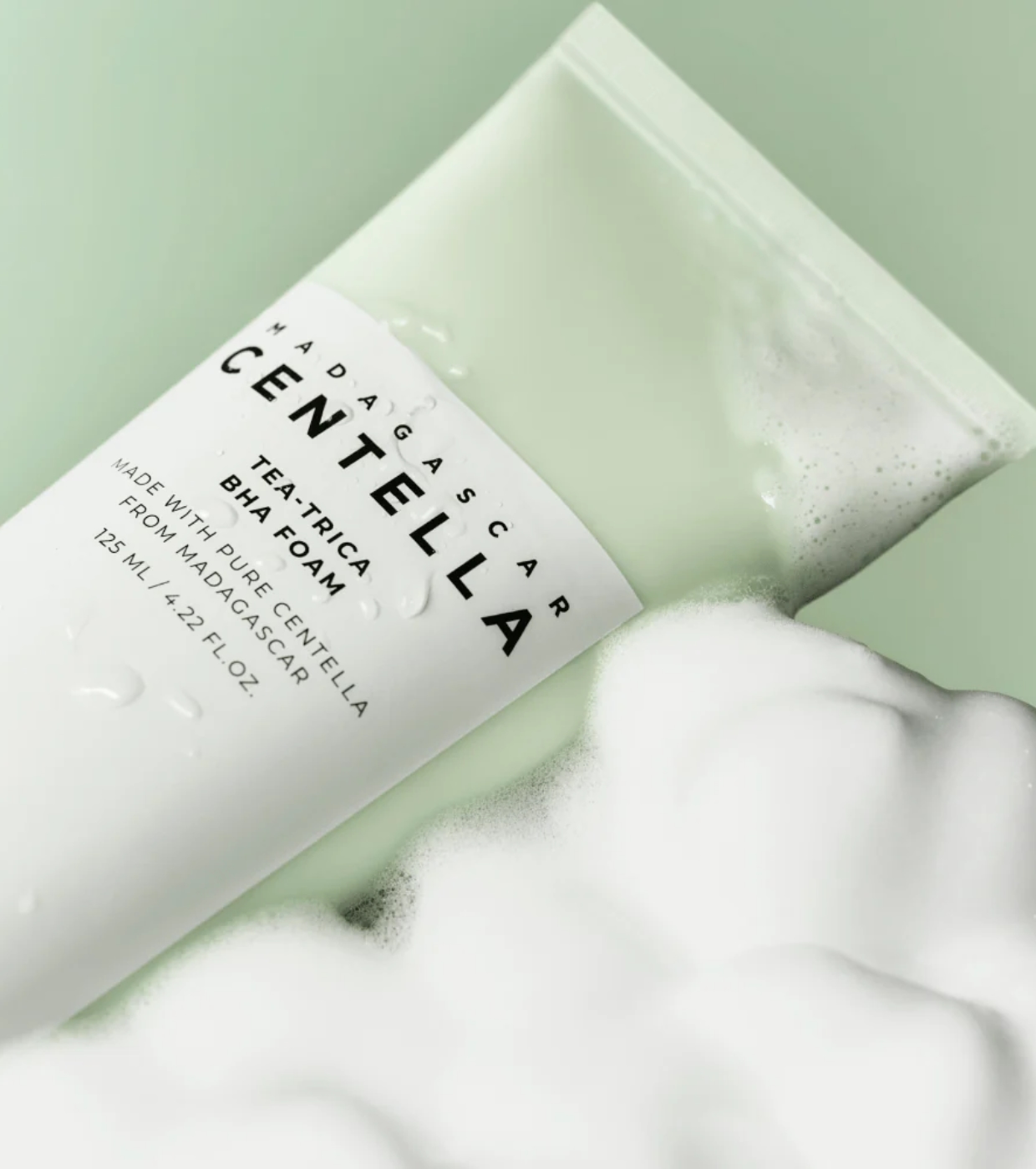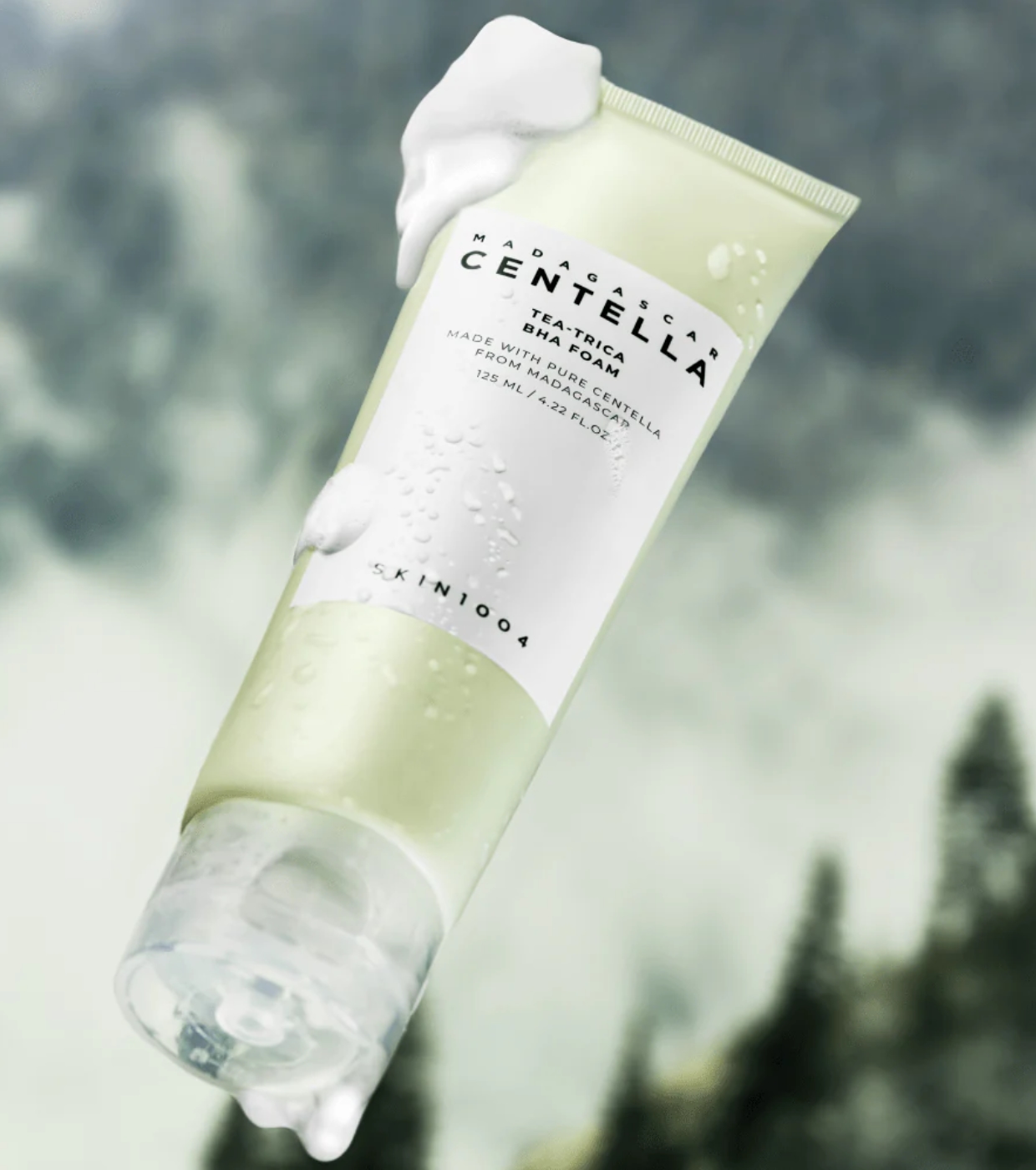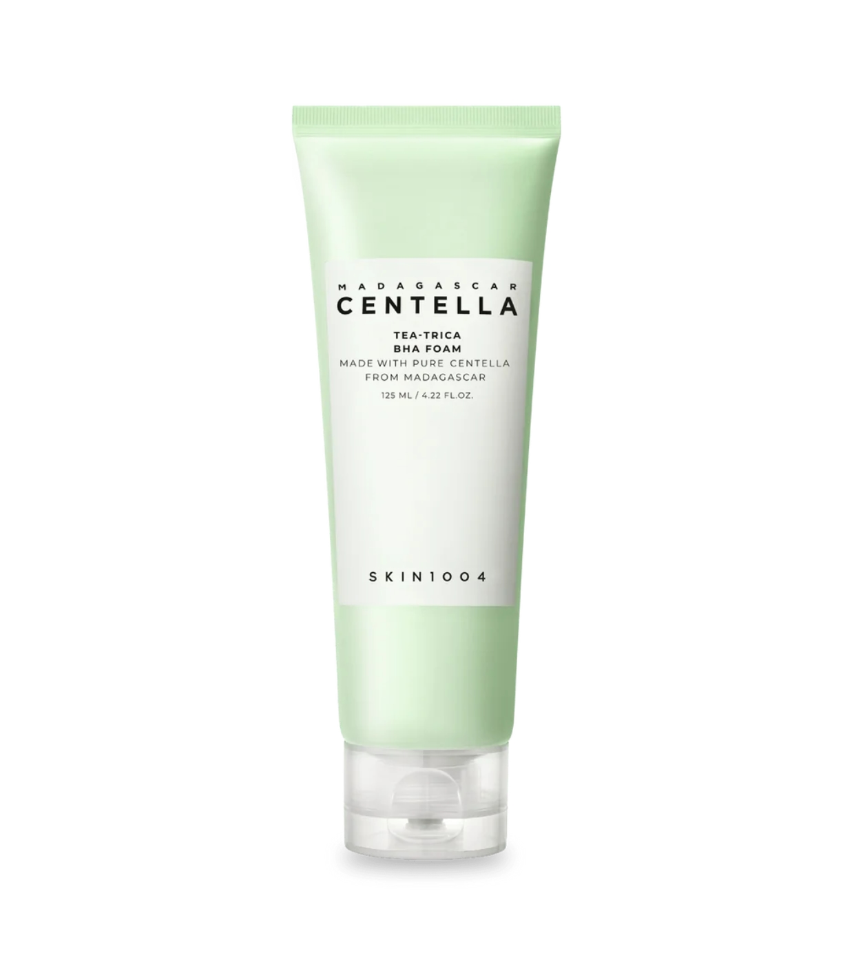 Descubra esta espuma de limpeza com Centella Asiatica de Madagascar de SKIN1004 formulada com BHA e árvore do chá, desenvolvida para desobstruir os poros e esfoliar suavemente as células mortas da pele.