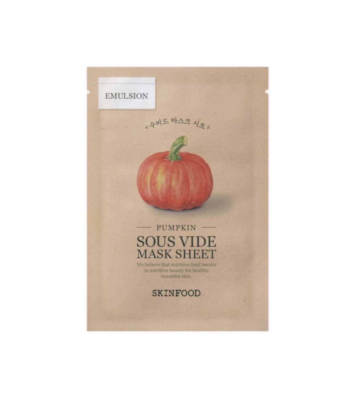 Máscara facial com extrato de abóbora da Skinfood que proporciona maciez e flexibilidade à pele, além de melhorar sua resiliência e saúde graças à sua emulsão sous-vide com extrato de abóbora.