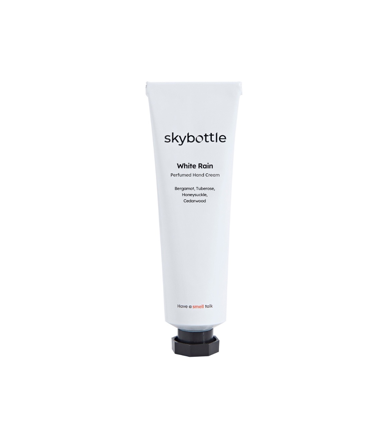 Imagine um jardim de flores, cercado por tuberosas e madressilvas, ainda fresco com orvalho: essa é a sensação que você experimentará ao aplicar o creme para as mãos White Rain da Skybottle .