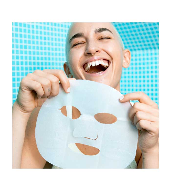 Refrescante e reconfortante! Esta máscara de biocelulose natural, concentrada em vitamina B3 e ácido hialurônico, hidrata e preenche a pele para um efeito calmante instantâneo.