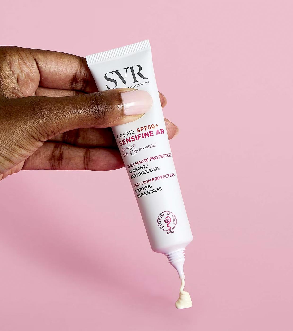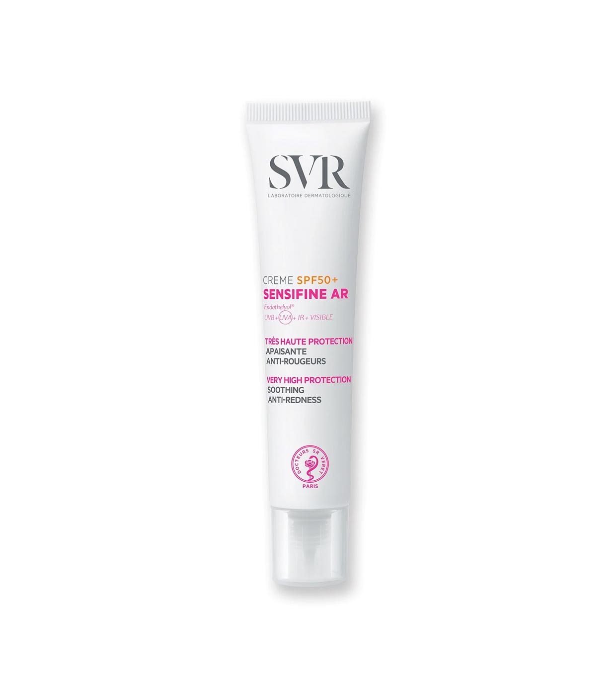 O creme solar Sensifine com FPS50+ da SVR combina proteção solar muito elevada com princípios ativos calmantes e anti-vermelhidão.