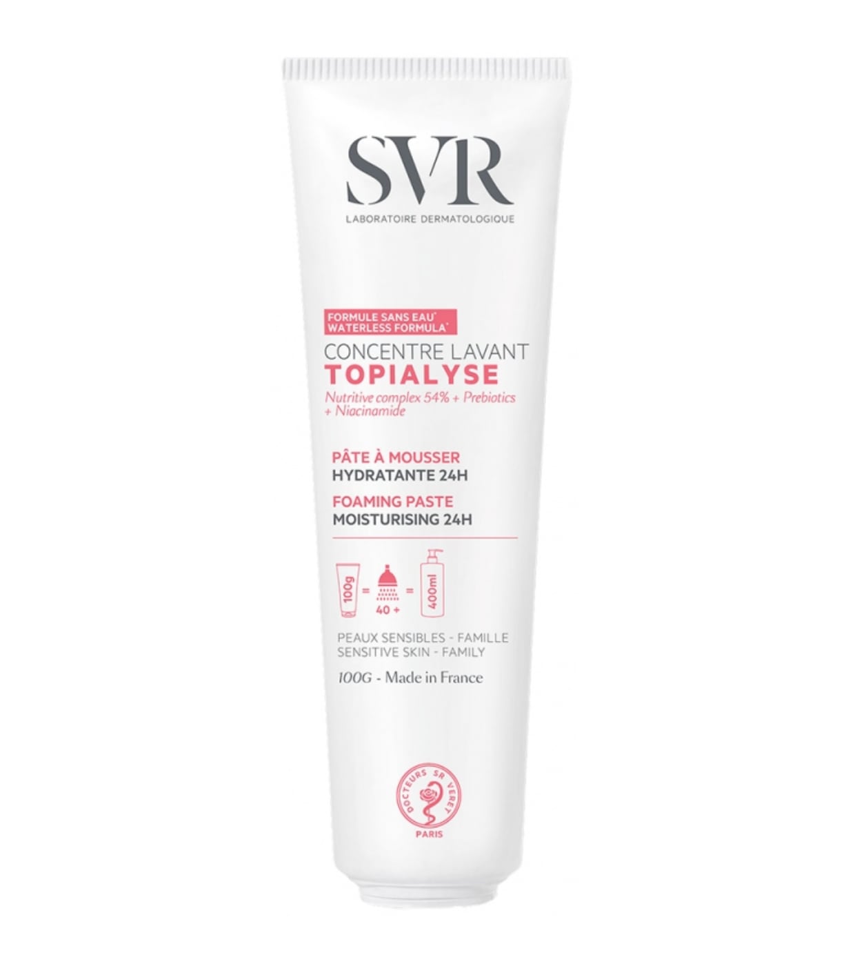 A espuma de limpeza concentrada da linha SVR Topialyse é uma pasta espumante especialmente desenvolvida para peles secas e sensíveis de toda a família, incluindo bebês (exceto bebês prematuros).