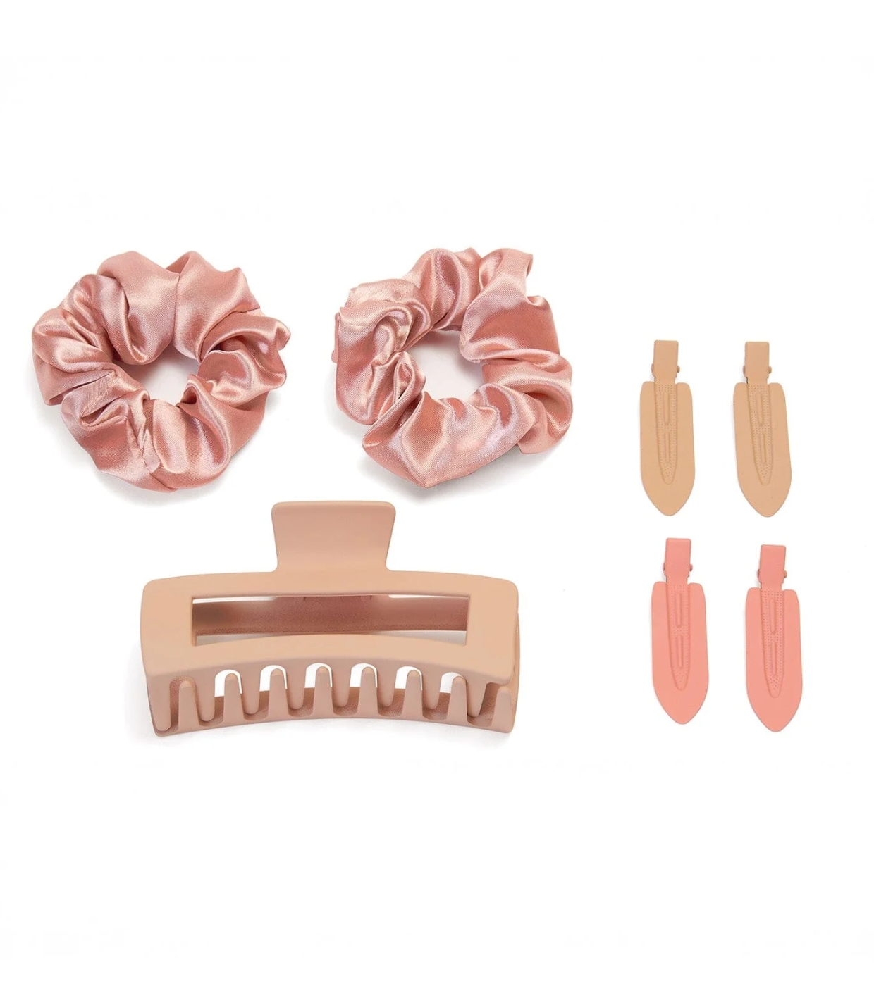 Inclui um clipe de garra resistente, perfeito para penteados rápidos e elegantes, elásticos de cetim, que cuidam e protegem seu cabelo, evitando que ele seja puxado, e clipes que não marcam, ideais para segurar seu cabelo enquanto você aplica maquiagem ou modela seu cabelo.