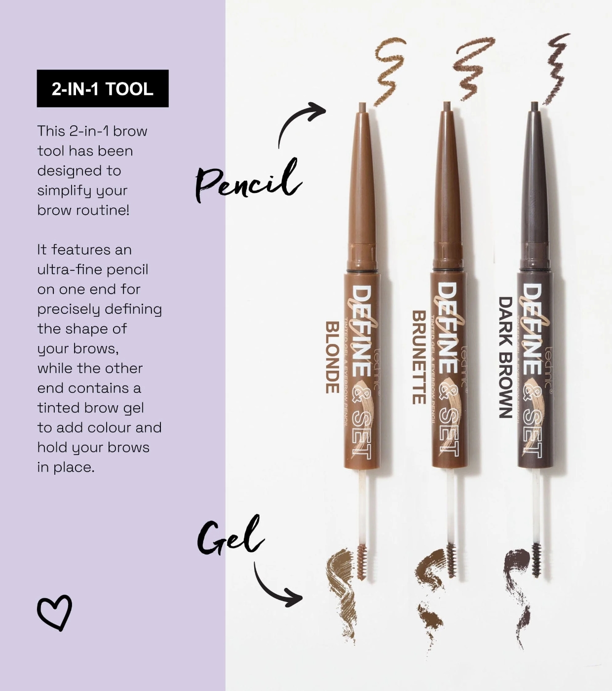 Simplifique sua rotina de sobrancelhas com o lápis de sobrancelhas 2 em 1 Technic Cosmetics + gel colorido Technic Cosmetics, ferramenta projetada para obter sobrancelhas perfeitamente definidas e definidas em segundos!