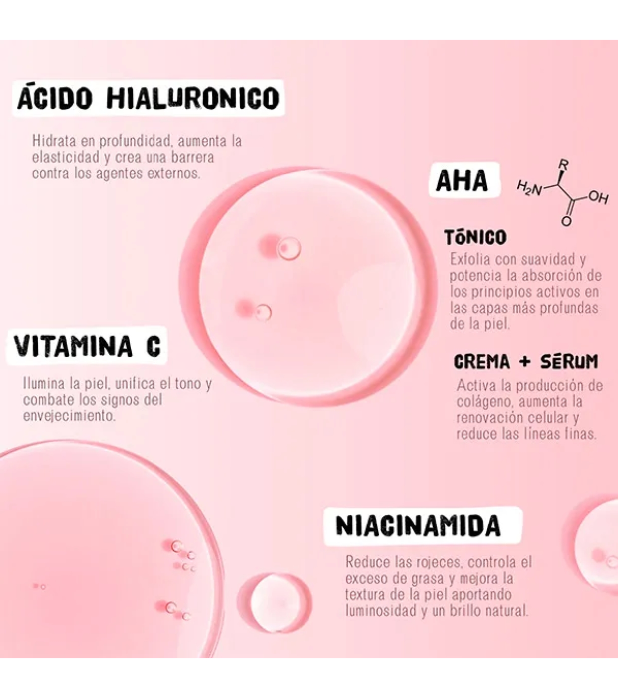 - Combina niacinamida, AHA, vitamina C e ácido hialurônico.