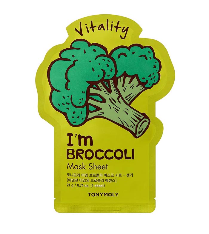 Máscara com brócolis de Tony Moly. Ele fornece uma energia revitalizante para pele cansada.