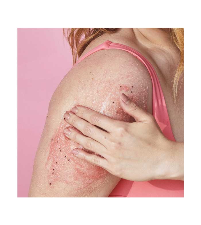 Feito com açúcar, manteiga de karité, melancia, colágeno vegano e uma variedade de óleos naturais, incluindo prímula, abacate, macadâmia, amêndoa doce, cártamo e laranja.