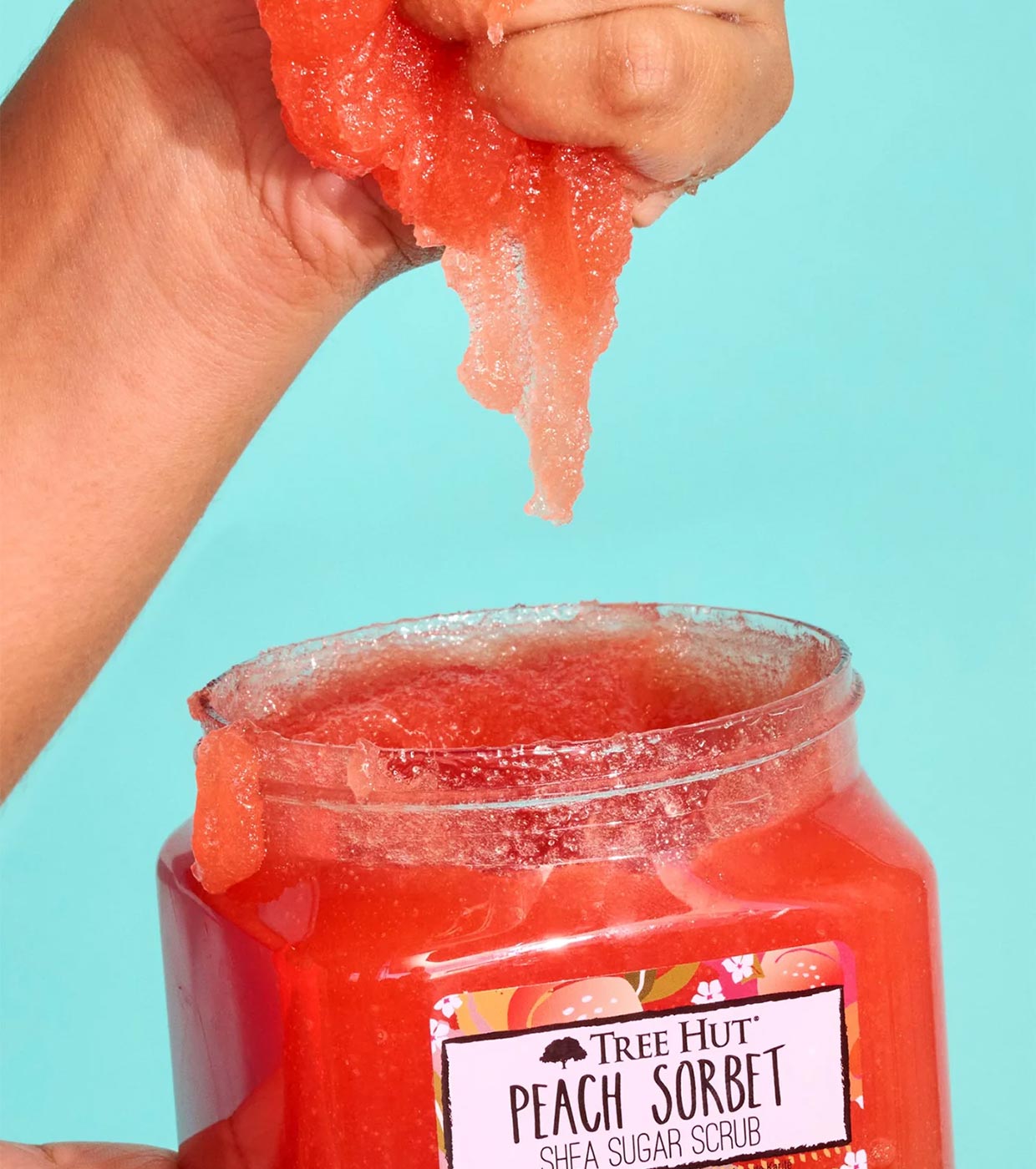 Revele uma pele radiante com o Esfoliante Corporal Shea Sugar Scrub de Tree Hut com o aroma doce e suculento de Peach Sorbet.