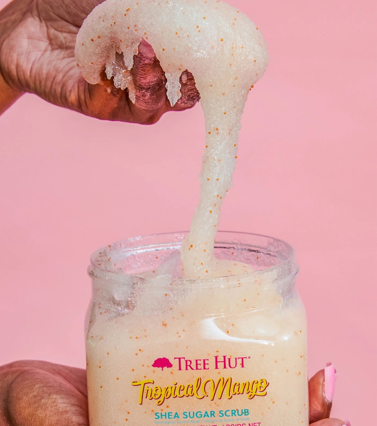 Transforme sua rotina de banho e revele uma pele radiante com o Esfoliante Corporal de Açúcar de Karité Tree Hut Shea Sugar .
