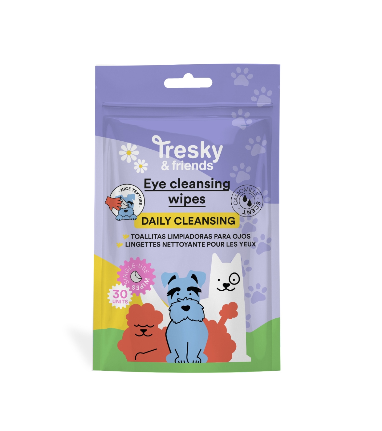 Os lenços de limpeza ocular TRESKY & FRIENDS são especialmente desenvolvidos para a higiene diária da região ao redor dos olhos de cães e gatos.