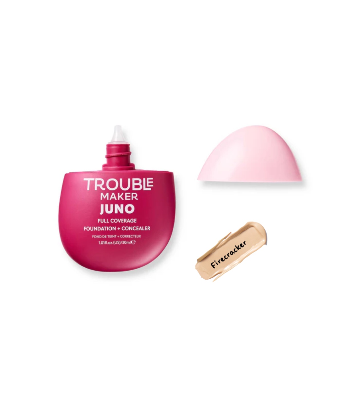 A base Trouble Maker Juno Full Coverage Matte é a base definitiva para uma aparência uniforme e duradoura, com um acabamento mate suave.