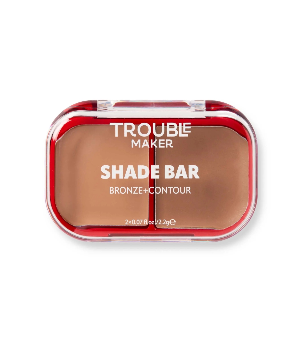 O Duo Bronzing e Contour Trouble Maker Shade Bar é o aliado perfeito para conseguir um rosto bronzeado, definido e luminoso em uma única passagem.