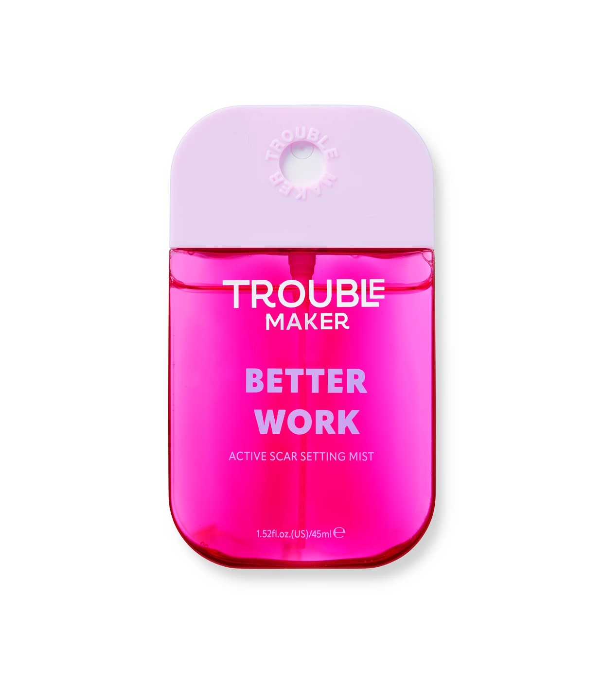 O spray fixador antivermelhidão Better Work da Trouble Maker é o spray fixador definitivo para maquiagem de longa duração com benefícios adicionais para o cuidado da pele.