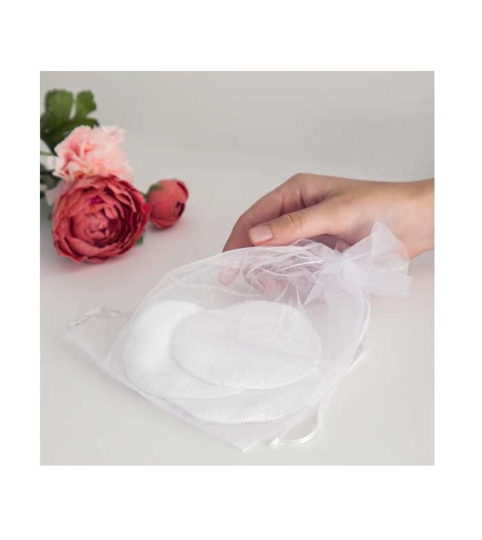 Eles são armazenados em seu próprio saco de organza, são reutilizáveis para que você possa colocá-los na máquina de lavar roupa junto com o saco e ... prontos para limpar o rosto novamente!