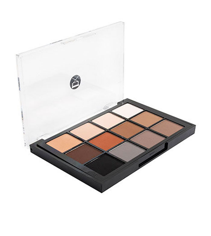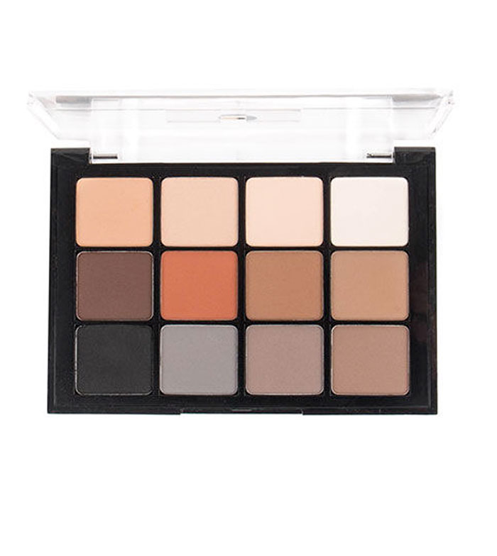 Uma paleta de sombras com 12 tons foscos, de neutros claros a castanhos profundos.