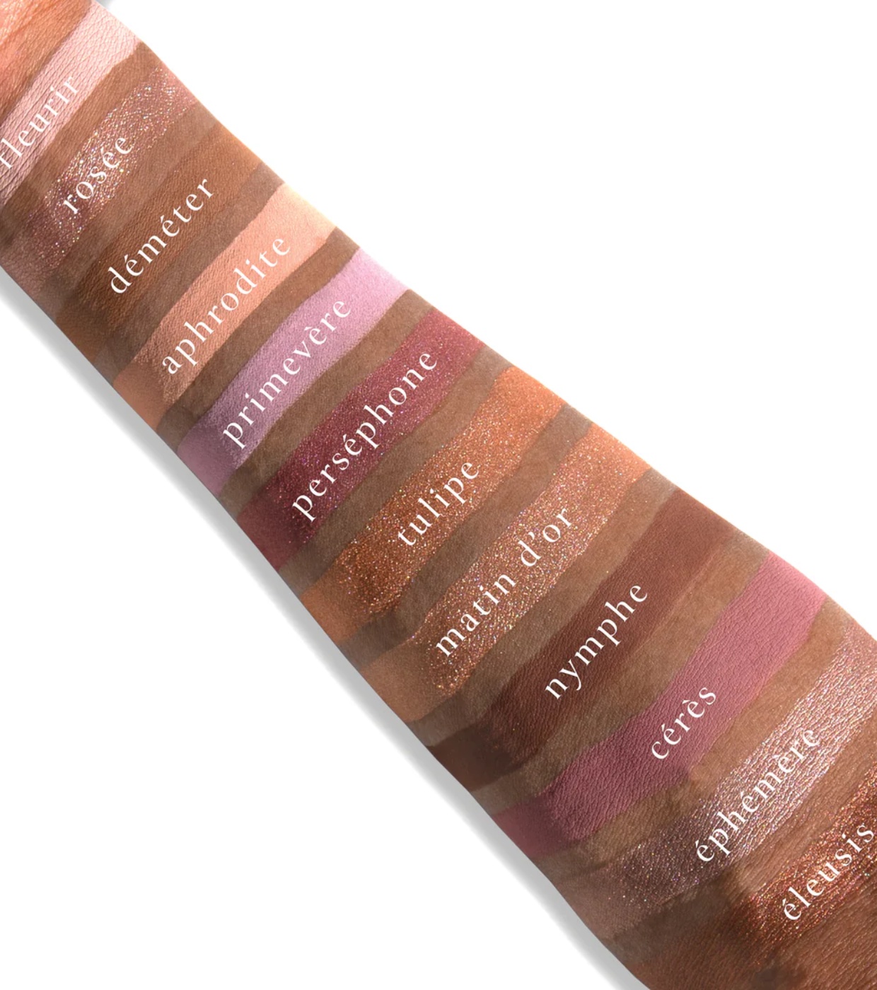 Shades 1 (Fleurir), 5 (Primevère), 9 (Nymphe), 10 (Cérès): Talc, Octyldodecyl Stearoyl Stearate, Zinc Stearate. Shade 2 (Rosée): Calcium Sodium Borosilicate, Octyldodecyl Stearoyl Stearate, Talc. Shade 3 (Déméter): Talc, Octyldodecyl Stearoyl Stearate, Silica. Shade 4 (Aphrodite): Talc, Zinc Stearate, Octyldodecyl Stearoyl Stearate. Shade 6 (Perséphone): Octyldodecyl Stearoyl Stearate, Talc, Zinc Stearate. Shade 7 (Tulipe): Octyldodecyl Stearoyl Stearate, Synthetic Fluorphlogopite, Talc. Shade 8 (Matin D'or): Synthetic Fluorphlogopite, Talc, Octyldodecyl Stearoyl Stearate. Shades 11 (Éphémère), 12 (Éleusis): Calcium Sodium Borosilicate, Octyldodecyl Stearoyl Stearate, Talc. (May Contain +/- Aluminum CI 77000, Blue 1 Lake CI 42090, Carmine CI 75470, Ferric Ferrocyanide CI 77510, Iron Oxides CI 77491/77492/77499, Manganese Violet CI 77742, Mica CI 77019, Red 40 CI 16035).