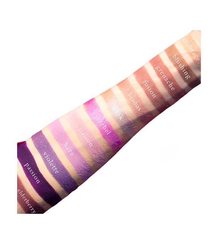 Shades 1 (Embrace), 2 (Blushing), 3 (Grenache), 4 (Fusion), 8 (Liason), 9 (Haze), 12 (Elderberry): Talc, Mica, Octyldodecyl Stearoyl Stearate, Zinc Stearate. Shade 5 (Bisous): Mica, Calcium Aluminum Borosilicate, Talc, Octyldodecyl Stearoyl Stearate, Silica, Zinc Stearate. Shade 6 (Wink): Aluminum Calcium Sodium Silicate, Mica, Talc, Octyldodecyl Stearoyl Stearate, Zinc Stearate. Shade 7 (Jezebel): Calcium Aluminum Borosilicate, Mica, Silica, Octyldodecyl Stearoyl Stearate, Talc, Zinc Stearate. Shade 10 (Violette): Aluminum Calcium Sodium Silicate, Mica, Talc, Octyldodecyl Stearoyl Stearate, Synthetic Fluorphlogopite, Calcium Aluminum Borosilicate, Silica, Zinc Stearate. Shade 11 (Passion): Talc, Mica, Octyldodecyl Stearoyl Stearate, Octyldodecanol, Zinc Stearate. Vegan Shades: 6,11. (May Contain +/-: Titanium Dioxide CI 77891, Iron Oxides CI 77491/77492/77499, Yellow 5 Lake CI 19140, Hydrogenated Polyisobutene, Red 28 Cl 45410, Ultramarines Blue CI 77007, Manganese Violet CI 77742, FD&C Blue 1 CI 42090, Aluminum CI 77000, Ferric Ferrocyanide CI 77510, Chromium Oxide Greens CI 77288, Carmine CI 75470, Tin Oxide, Sodium Benzoate, Potassium Sorbate).