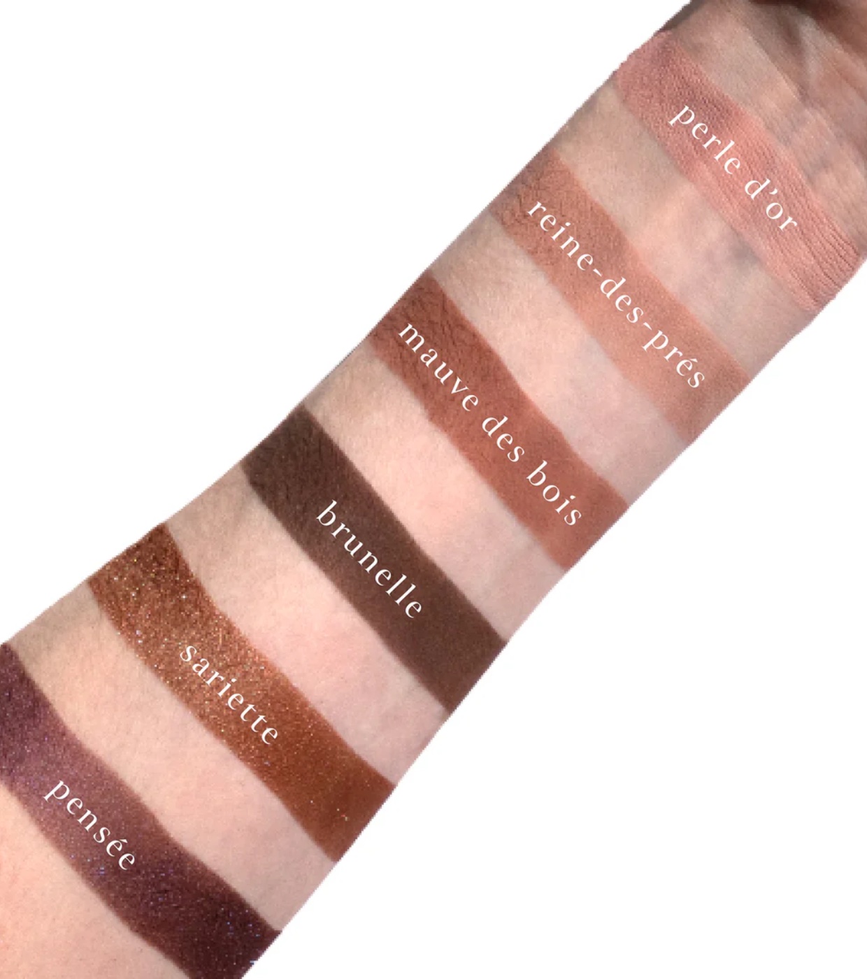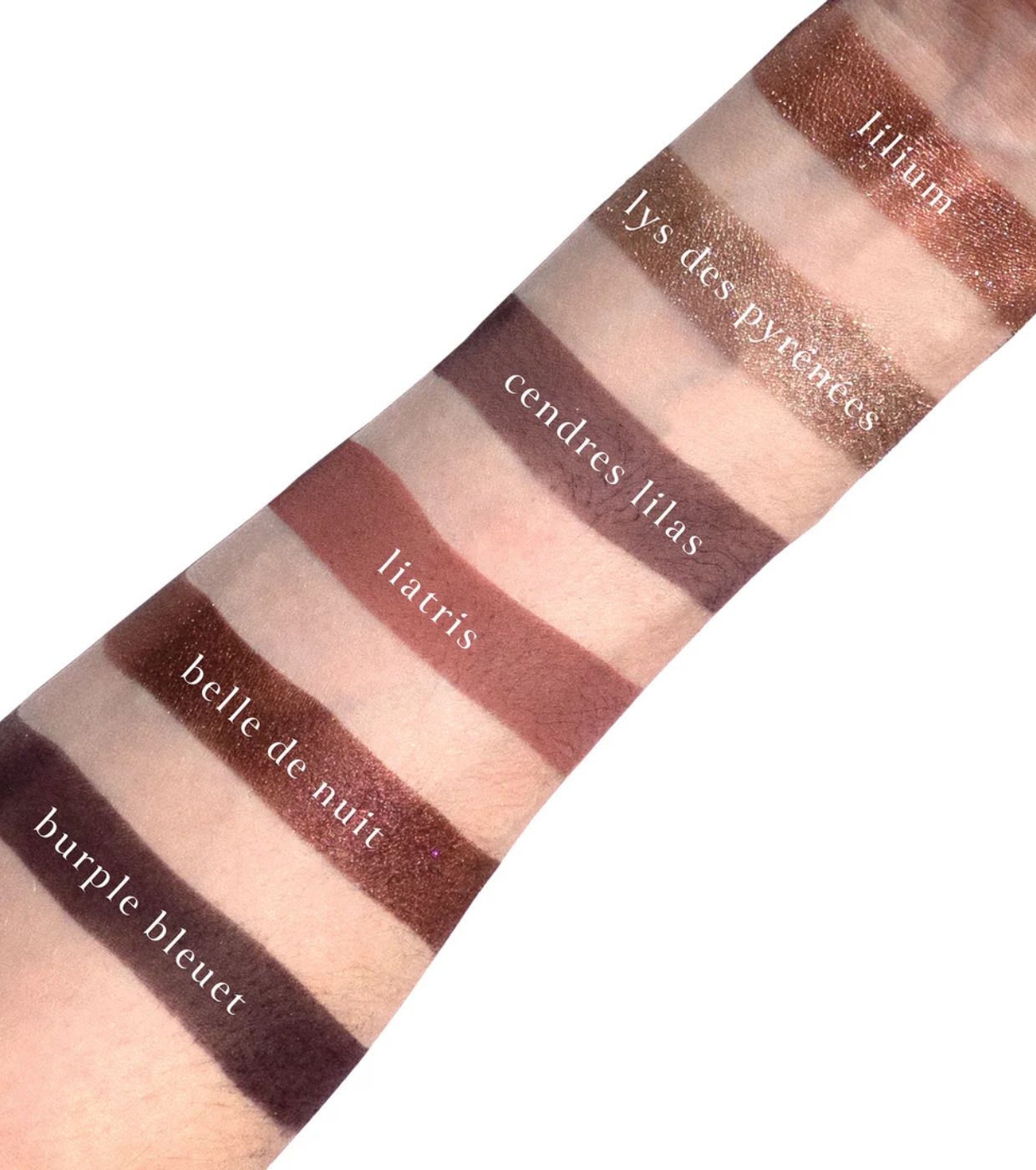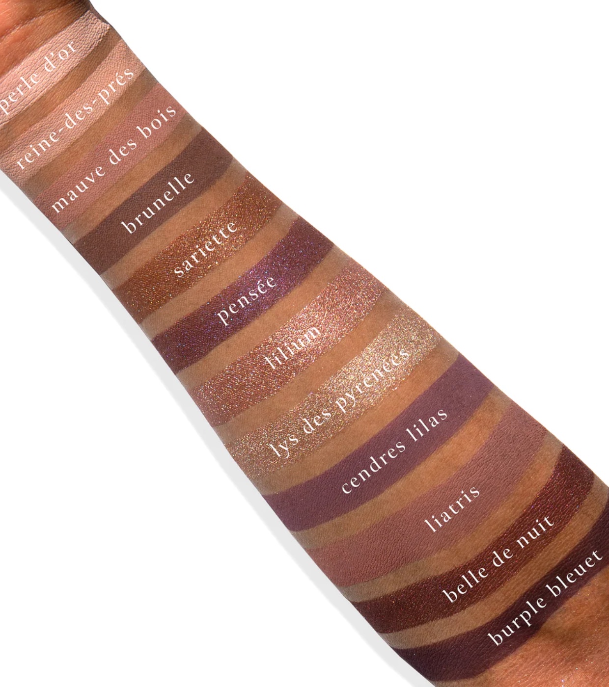 Shades 1 (Perle D'or), 2 (Reine-des-prés), 3 (Mauve des Bois), 4 (Brunelle), 9 (Cendres Lilas), 10 (Liatris): Talc Octyldodecyl Stearoyl Stearate Zinc Stearate. Shade 5 (Sariette), 12 Burple Bleuet: Talc Octyldodecyl Stearoyl Stearate, Silica, Zinc Stearate. Shade 6 (Pensée), 11 (Belle de Nuit): Octyldodecyl Stearoyl Stearate, Talc, Silica, Zinc Stearate. Shade 7 (Lilium) , 8 (Lys des Pyrénées): Octyldodecyl Stearoyl Stearate, Talc, Zinc Stearate, Silica. (May Contain +/- Aluminum CI 77000, Blue 1 Lake CI 42090, Carmine CI 75470, Copper Powder CI 77400, Ferric Ferrocyanide CI 77510, Iron Oxides CI 77491/CI 77492/CI 77499, Manganese Violet CI 77742, Mica CI 77019, Tin Oxide CI 77861, Titanium Dioxide CI 77891, Ultramarines Blue CI 77007, Sodium Dehydroacetate.)