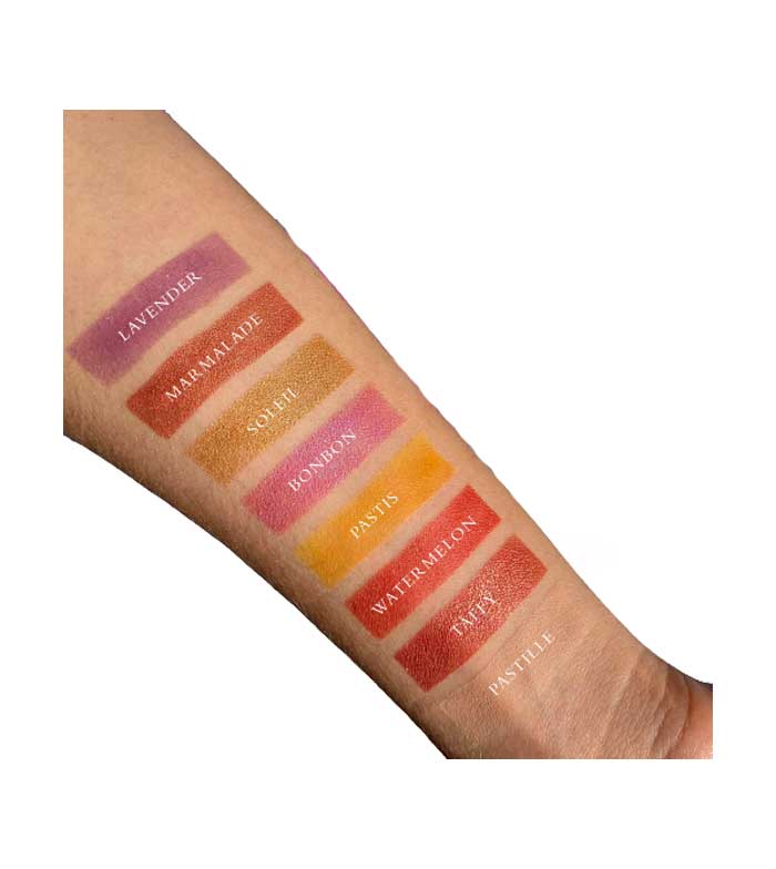 Shades 1 (Pastille), 4 (Pastis): Talc, Mica, Octyldodecyl Stearoyl Stearate, Zinc Stearate. Shades 2 (Taffy): Mica, Calcium Sodium Borosilicate, Talc, Octyldodecyl Stearoyl Stearate, Silica, Calcium Aluminum Borosilicate, Hydrogenated Polyisobutene, Zinc Stearate. Shades 3 (Watermelon): Calcium Aluminum Borosilicate, Mica, Octyldodecyl Stearoyl Stearate, Talc, Zinc Stearate, Hydrogenated Polyisobutene. Shades 5 (Bonbon): Calcium Aluminum Borosilicate, Mica, Octyldodecyl Stearoyl Stearate, Silica, Talc, Zinc Stearate. Shades 6 (Lavender): Talc, Mica, Octyldodecyl Stearoyl Stearate, Zinc Stearate, Octyldodecanol, Potassium Sorbate, Sodium Benzoate. Shades 7 (Marmalade): Calcium Aluminum Borosilicate, Silica, Octyldodecyl Stearoyl Stearate, Talc, Mica, Zinc Stearate. Shade 8 (Soleil): Mica, Calcium Sodium Borosilicate, Talc, Octyldodecyl Stearoyl Stearate, Zinc Stearate. Vegan Shades: 1,3,4,6,8. (May Contain +/- : Titanium Dioxide CI 77891, Tin Oxide CI 77861, Iron Oxides CI 77491/77492/77499, Carmine CI 75470, Yellow 5 Lake CI 19140, Manganese Violet CI 77742, Red 40 Lake CI 15850, Ferric Ferrocyanide CI 77510.)