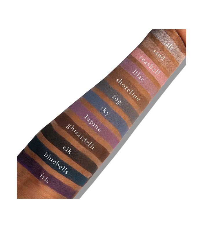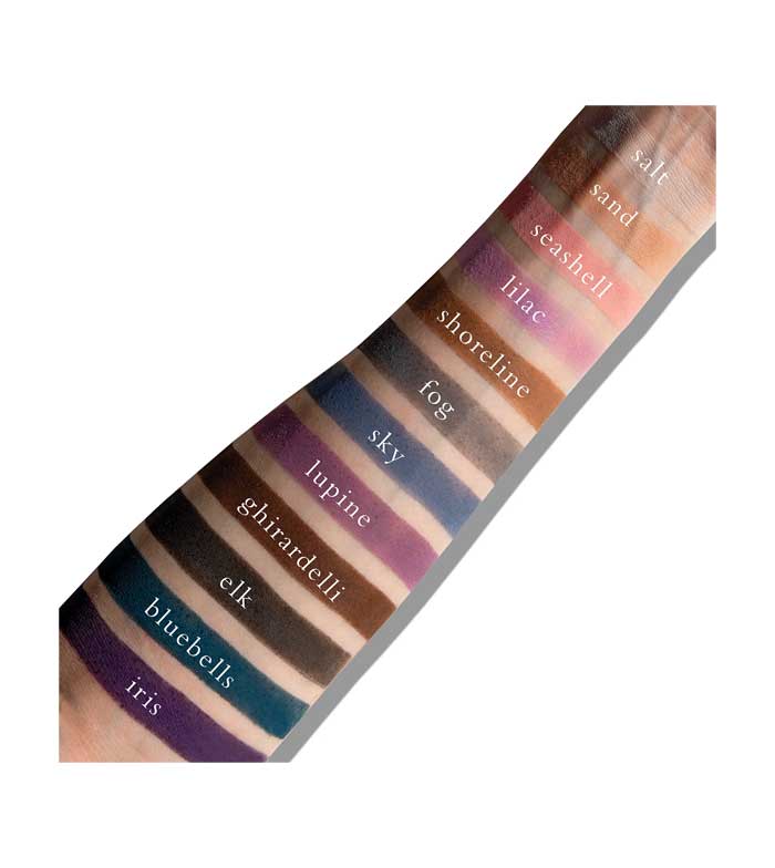 Shade 1 (Salt), Shade 2 (Sand), Shade 3 (Seashell), Shade 5 (Shoreline), Shade 6 (Fog), Shade 7 (Sky), Shade 8 (Lupine), Shade 9 (Ghiradelli), Shade 10 (Elk), Shade 11 (Bluebells), Shade 12 (Iris): Talc, Mica, Octyldodecyl Stearoyl Stearate, Zinc Stearate.