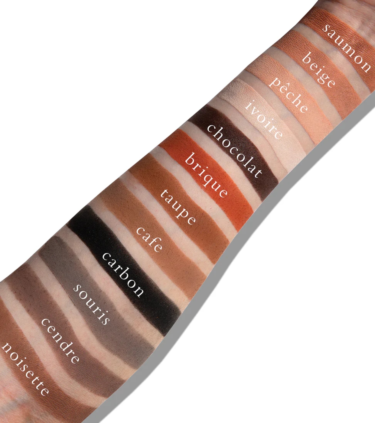 Shades 1 (Cannelle), 2 (Beige), 3 (Pêche), 4 (Ivoire), 5 (Chocolate), 6 (Brique), 7 (Taupe), 8 (Café), 9 (Carbon), 10 (Souris), 11 (Cendre), 12 (Noisette): Talc, Mica, Octydodecyl Stearoyl Stearate, Zinc Stearate, Sodium Benzoate, Potassium Sorbate.
