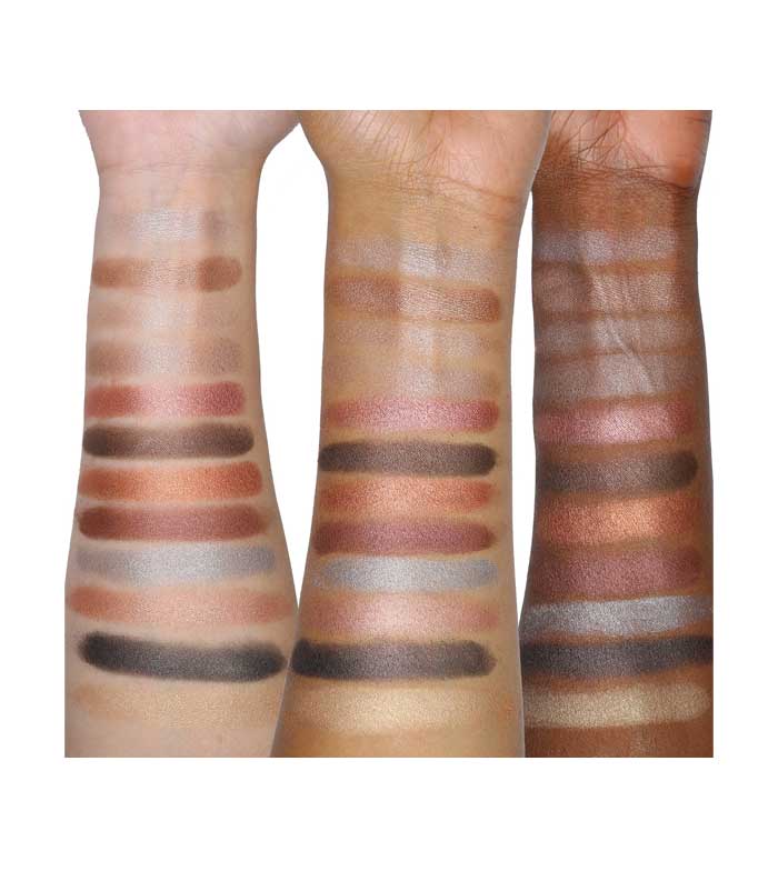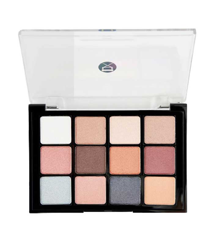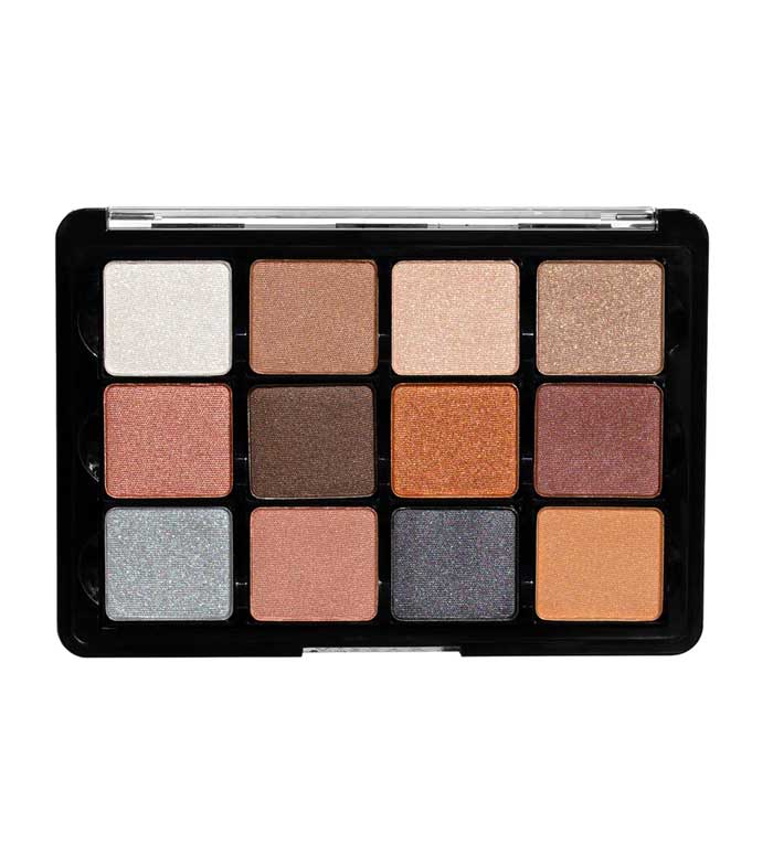 Uma paleta de sombras com 12 tons cintilantes em acabamentos acetinados e metálicos.