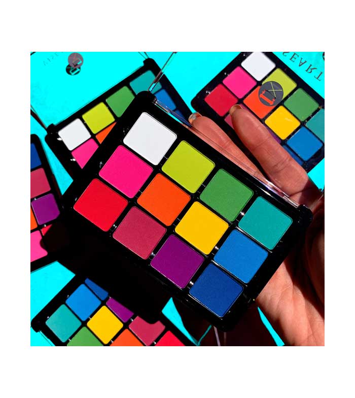 Uma paleta de sombras ousada com 12 tons neon multicoloridos com acabamento fosco.