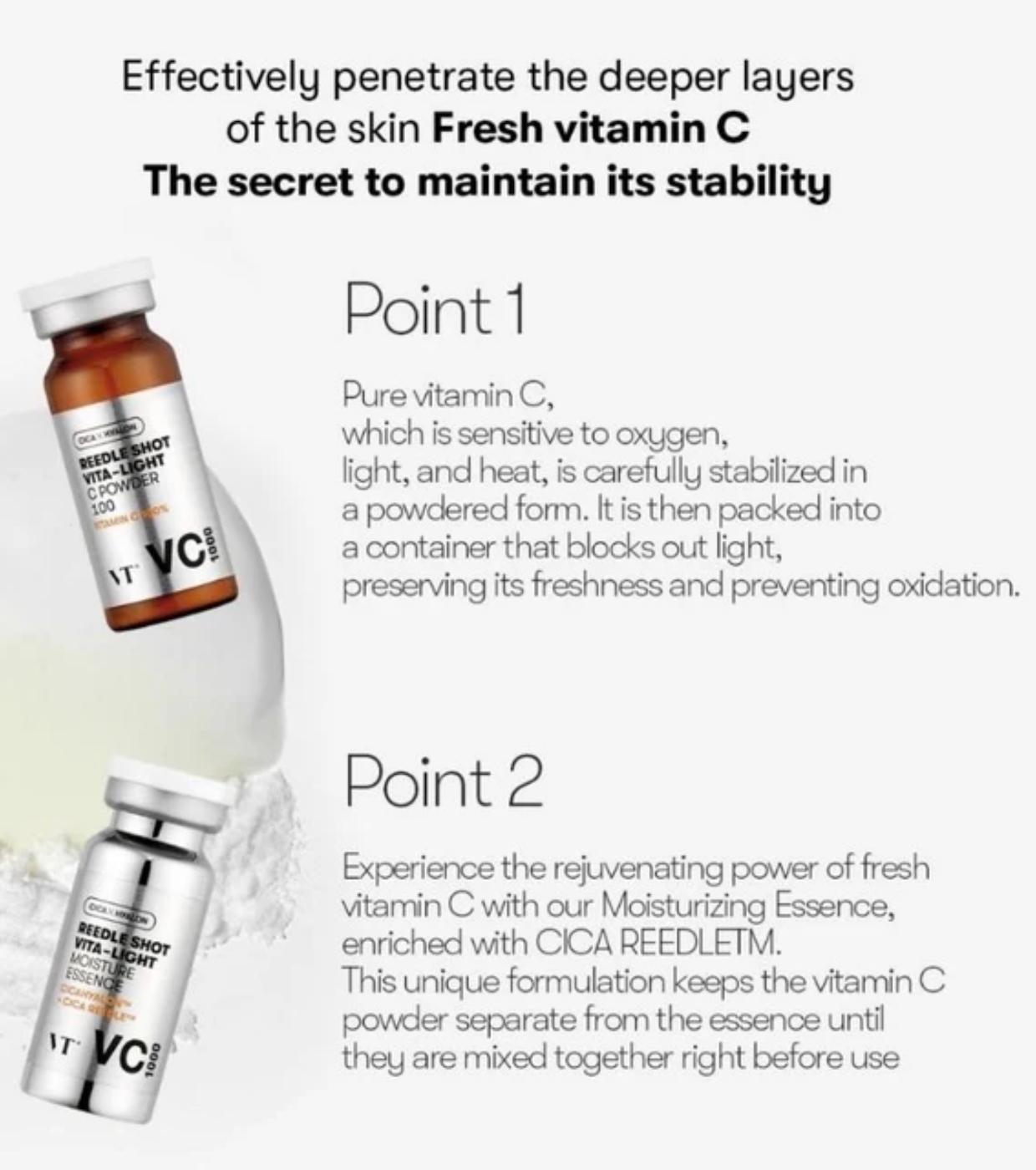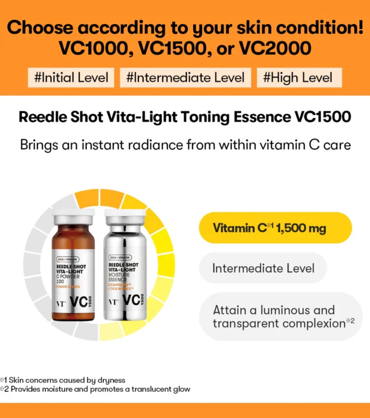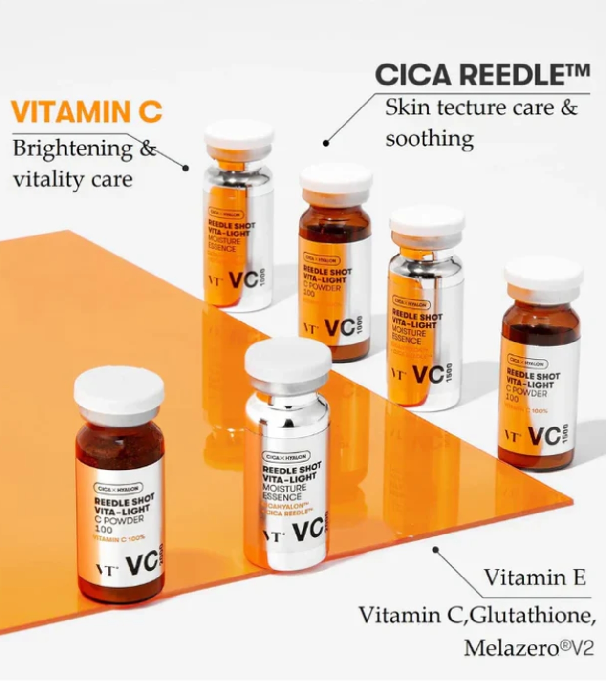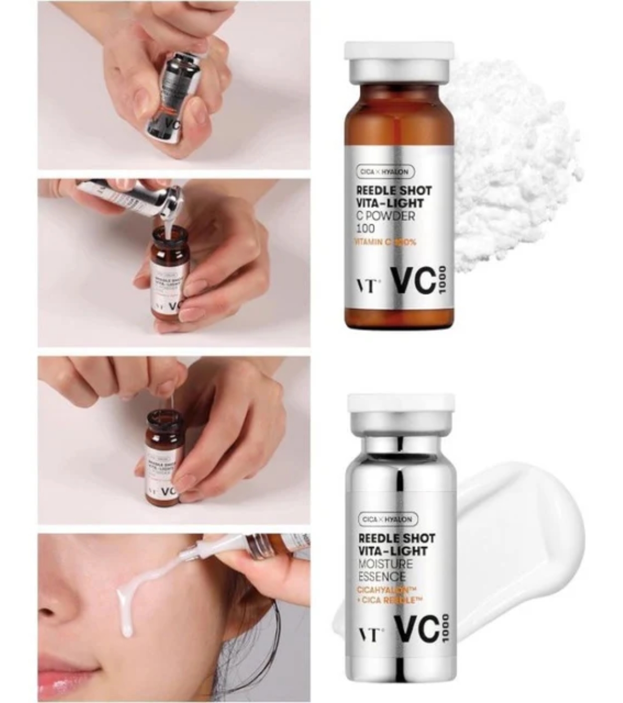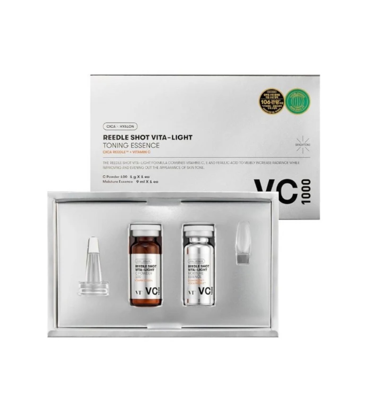 - Textura e sensação de pele: A textura leve e úmida do VT Reedle Shot Vita-Light Toning Essence VC 1000 é rapidamente absorvida, deixando a pele fresca, macia e luminosa sem uma sensação pegajosa. Perfeito para quem procura hidratação intensa.