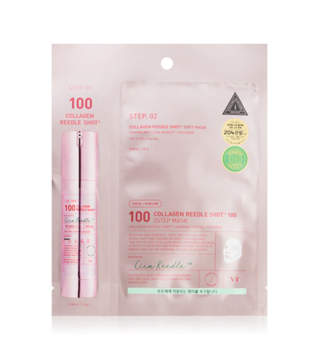 Esta máscara de 2 passos 2-Step Collagen Reddle Shot 100 da VT Cosmetics com tecnologia Collagen Reedle Shot foi desenvolvida para firmar, revitalizar e melhorar a elasticidade da pele, proporcionando um efeito mais suave e volumoso desde a primeira utilização.