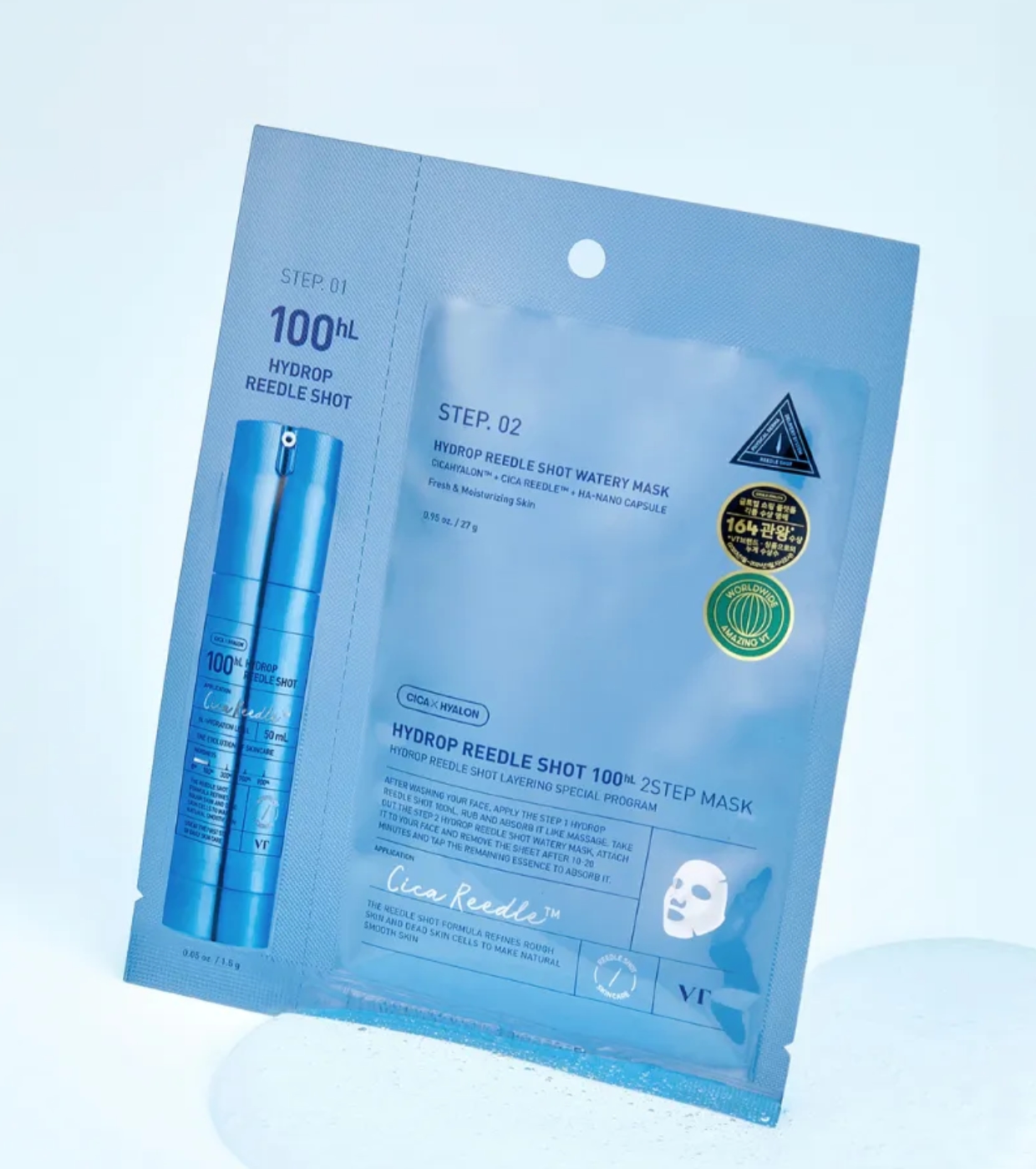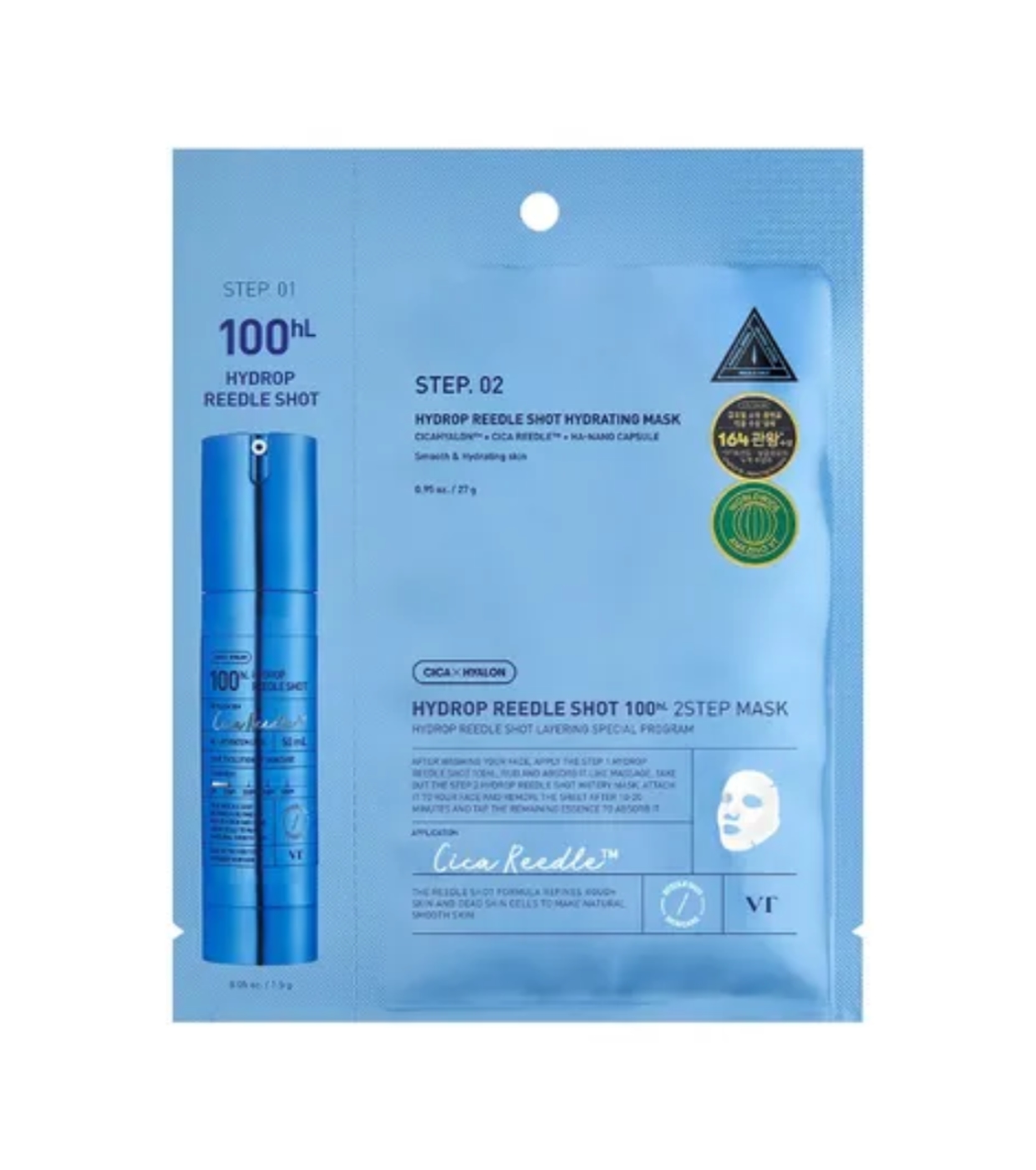Esta máscara de 2 passos 2-Step Hydrop Reedle Shot 100 da VT Cosmetics, com tecnologia Hydrop Reedle Shot, foi desenvolvida para hidratar intensamente de dentro para fora e melhorar a absorção de ingredientes ativos, ajudando a restaurar uma pele mais saudável e equilibrada.