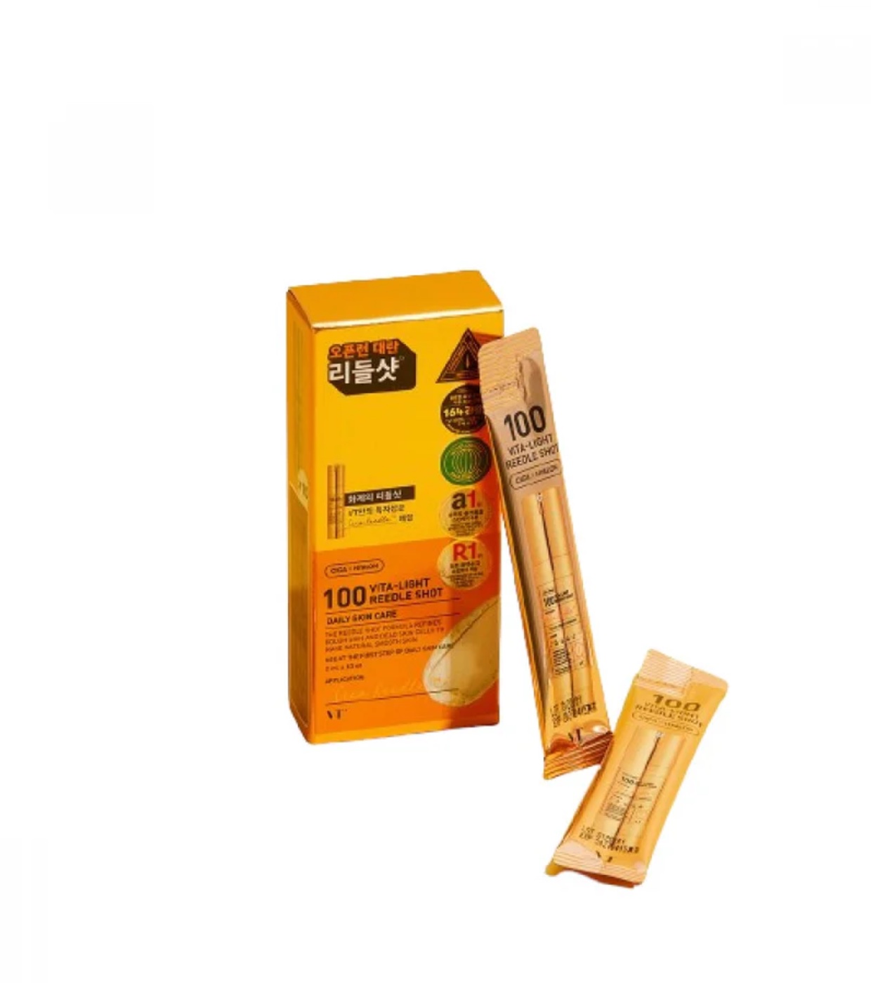 VT Cosmetics O sérum Vita-Light Reedle Shot 100 usa a inovadora tecnologia Cica Reedle™, microagulhas com extrato de centella asiática para penetrar suavemente na epiderme e maximizar a absorção dos ingredientes ativos.