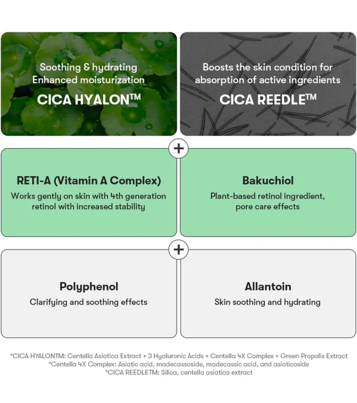 Water, Dipropylene Glycol, Glycerin, Niacinamide, Butylene Glycol, Macadamia Ternifolia Seed Oil, Dimethyl Isosorbide, 1,2-Hexanediol, Ethylhexyl Palmitate, Sodium Polyacrylate, Sodium Acrylate/Sodium Acryloyldimethyl Taurate Copolymer, Glyceryl Stearate, Polyglyceryl-6 Stearate, Polyisobutene, Silica, Hydroxypinacolone Retinoate, Allantoin, Glycereth-26, Ethylhexylglycerin, Caprylyl Glycol, Xanthan Gum, Dipotassium Glycyrrhizate, Adenosine, Caprylyl/Capryl Glucoside, Sorbitan Oleate, Polyglyceryl-6 Behenate, Sodium Hyaluronate, Lecithin, Polysorbate 20, Centella Asiatica Extract, Retinol, Bakuchiol, Helianthus Annuus (Sunflower) Seed Oil, Beta-Carotene, Propolis Extract, Diospyros Kaki Leaf Extract, Vitis Vinifera (Grape) Fruit Extract, Coffea Arabica (Coffee) Seed Extract, Carthamus Tinctorius (Safflower) Flower Extract, Polygonum Cuspidatum Root Extract, Asiaticoside, Castanea Crenata (Chestnut) Shell Extract, Camellia Sinensis Leaf Extract, Zanthoxylum Piperitum Fruit Extract, Madecassoside, Madecassic Acid, Asiatic Acid