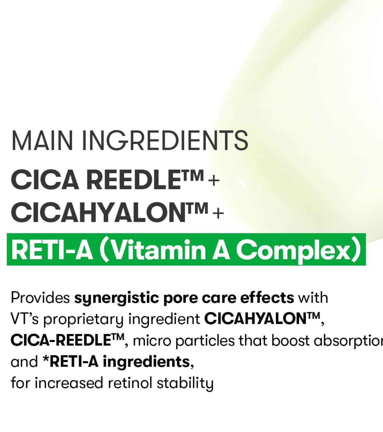 - Cica Reedle™: Melhora a absorção dos princípios ativos. Oferece um efeito calmante e revitalizante com a eficácia da Centella Asiatica.