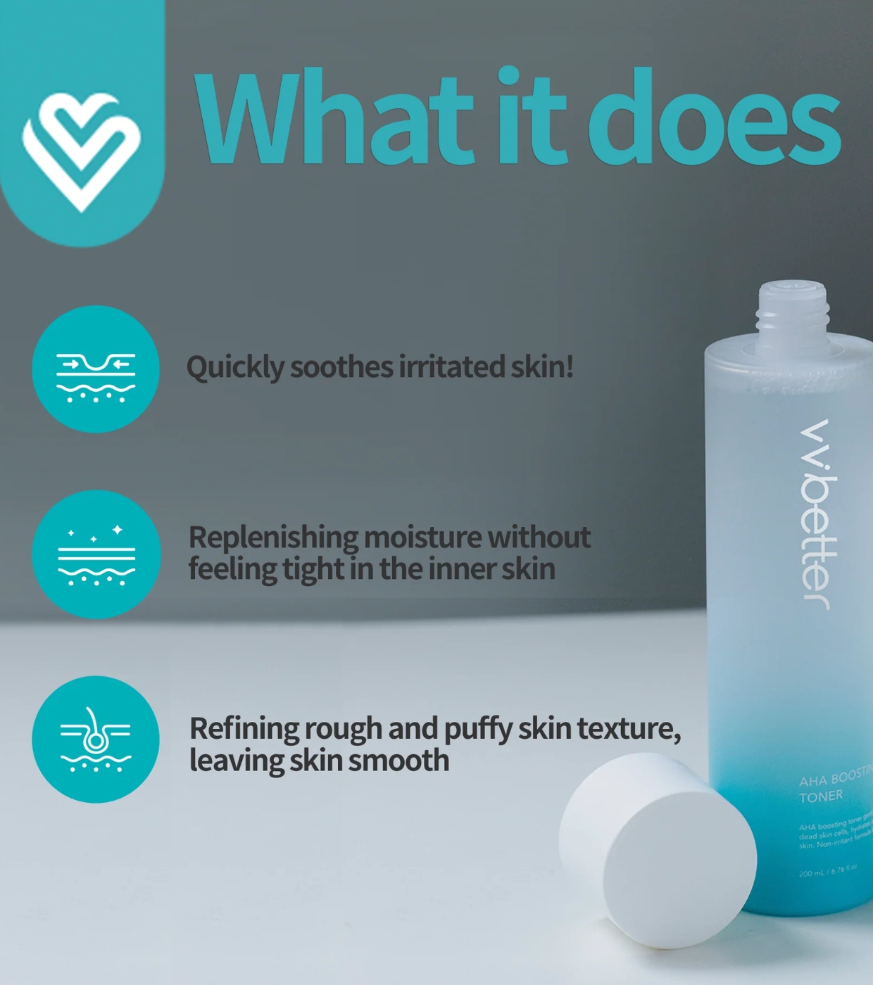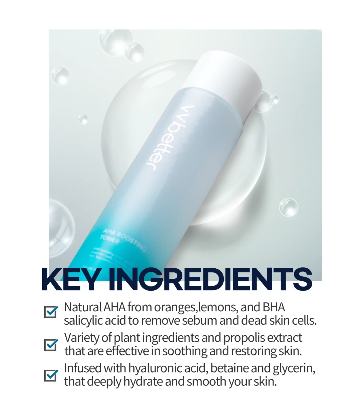 Uma pele radiante começa com uma renovação suave. Este AHA Boosting Toner da vvbetter com pH neutro é o aliado ideal para quem busca uma pele mais iluminada, firme e uniforme sem abrir mão da delicadeza.