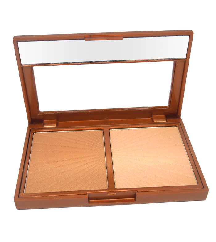 Paleta dupla que contém bronzeamento cetim e iluminador com brilho, com reflexos dourados muito sutis e uma pigmentação média. Você pode delinear e iluminar seu rosto, criando efeitos que é a favor do bem como um acabamento natural e sofisticado.