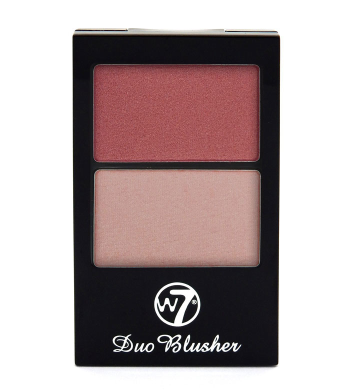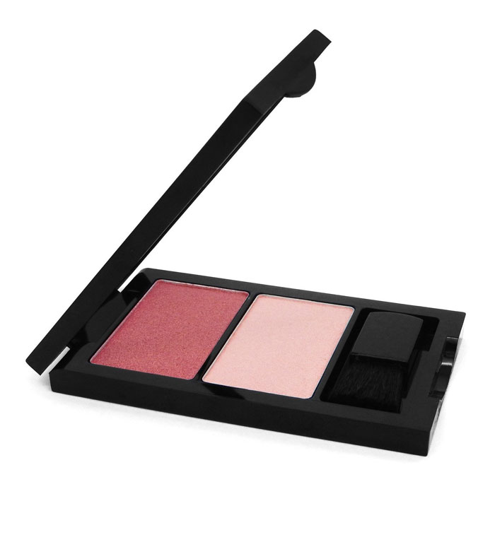 Duo de blushes compactos. Esta paleta inclui um tom rosa suave e um intenso, ambos com um toque de brilho dourado. Inclui também um pequeno pincel para aplicar o rouge.